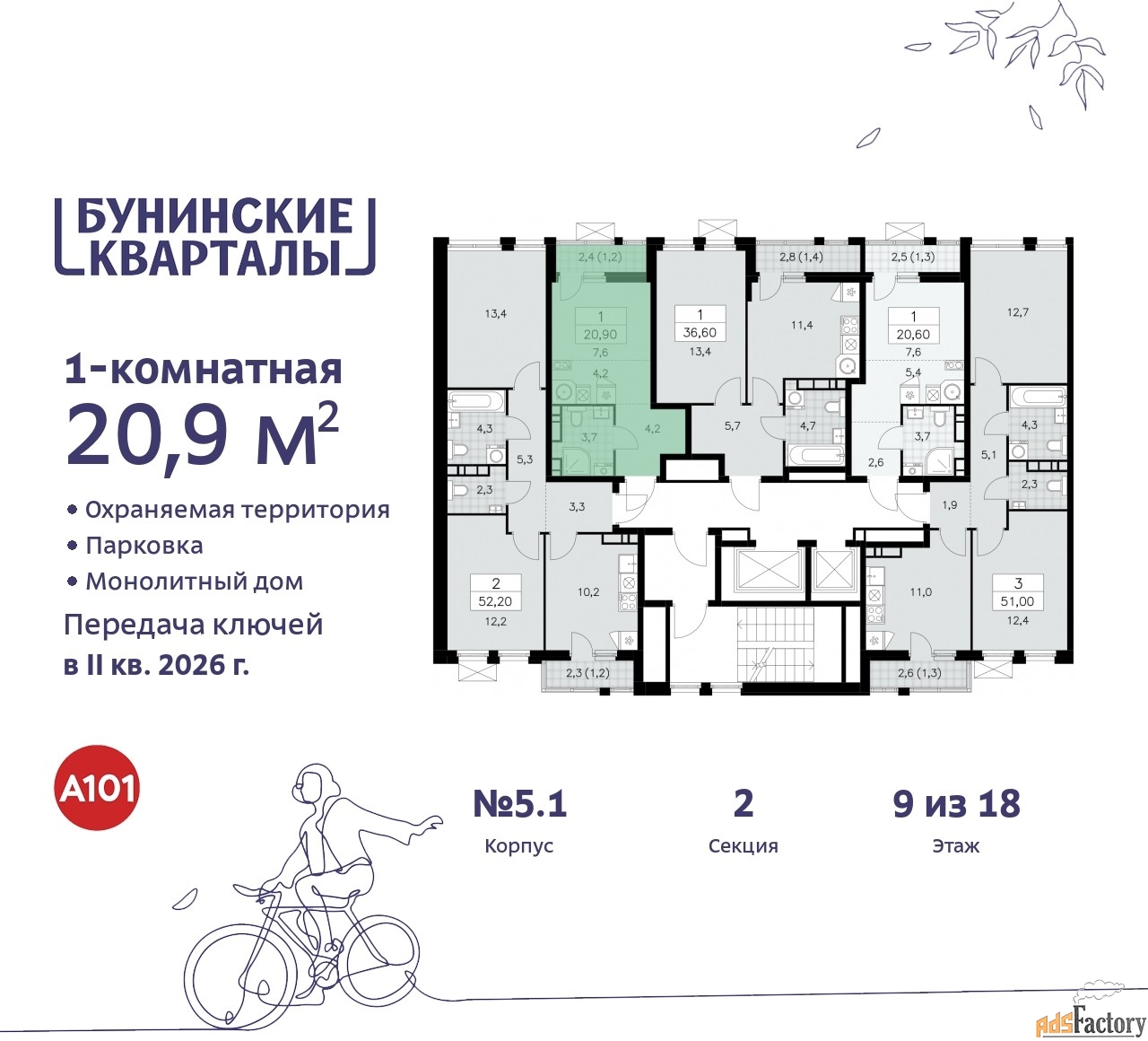 Дом монолитный, многоподъездный, переменной этажности, от 9 до 18 этажей. Квартира находится во 2-й секции высотой 18 этажей в корпусе 5.1. На этаже 5 квартир. В подъезде 1 пассажирский и 1 грузовой лифт. Начало строительства - 4 квартал 2023 года. Окончание строительства - 2 квартал 2026 года. Оформление сделки по договору долевого участия.