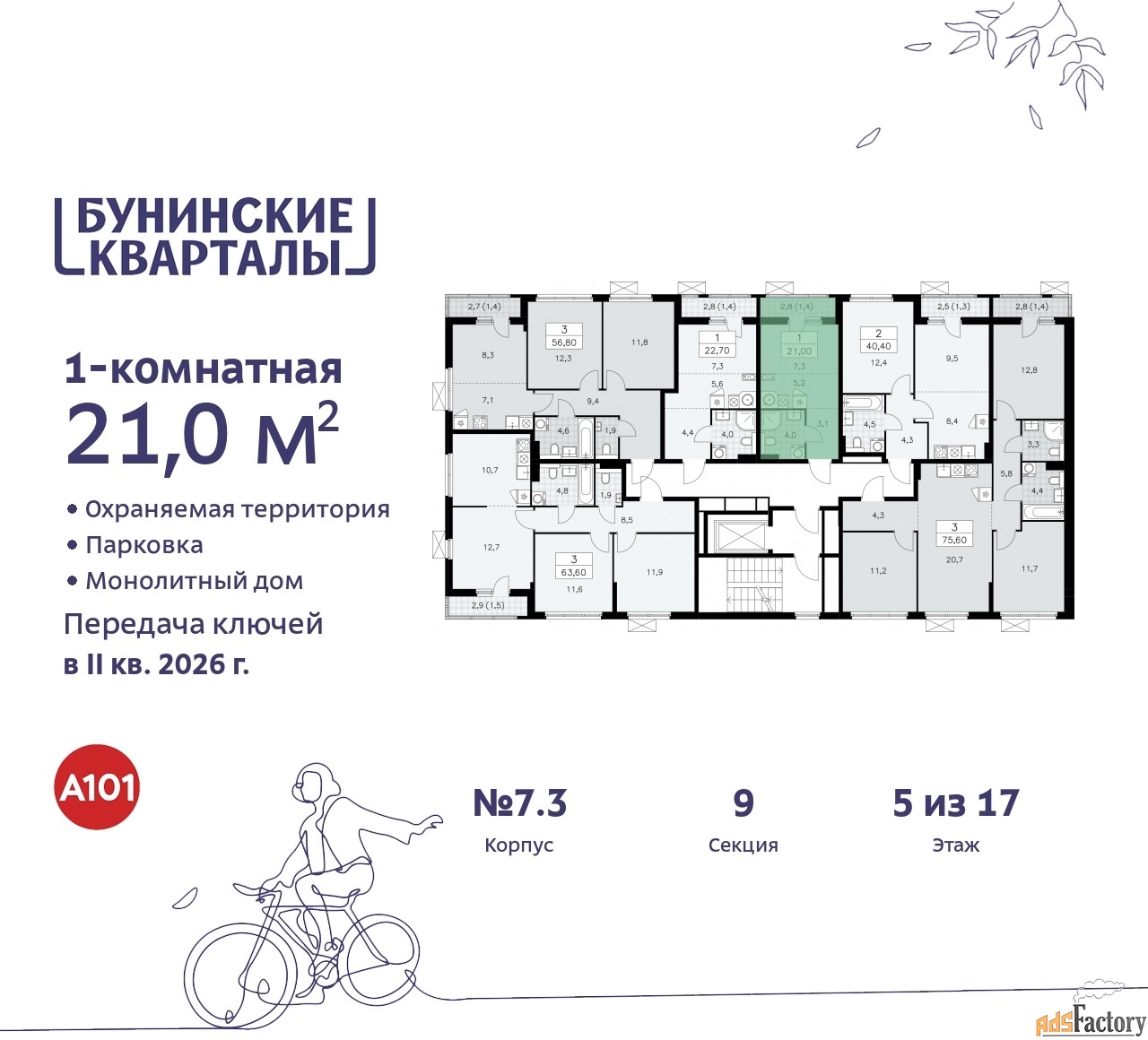 Дом монолитный, многоподъездный, переменной этажности, от 9 до 17 этажей. Квартира находится в 1-й секции высотой 9 этажей в корпусе 7.3. На этаже 6 квартир. В подъезде 1 грузовой лифт. Начало строительства - 4 квартал 2023 года. Окончание строительства - 2 квартал 2026 года. Оформление сделки по договору долевого участия.