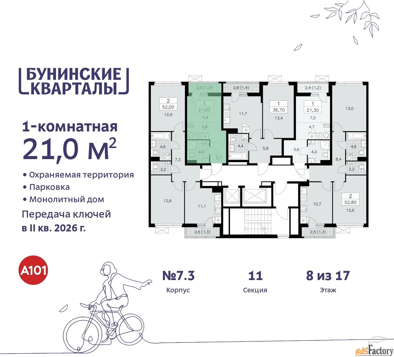 Дом монолитный, многоподъездный, переменной этажности, от 9 до 17 этажей. Квартира находится в 3-й секции высотой 17 этажей в корпусе 7.3. На этаже 5 квартир. В подъезде 1 пассажирский и 1 грузовой лифт. Начало строительства - 4 квартал 2023 года. Окончание строительства - 2 квартал 2026 года. Оформление сделки по договору долевого участия.