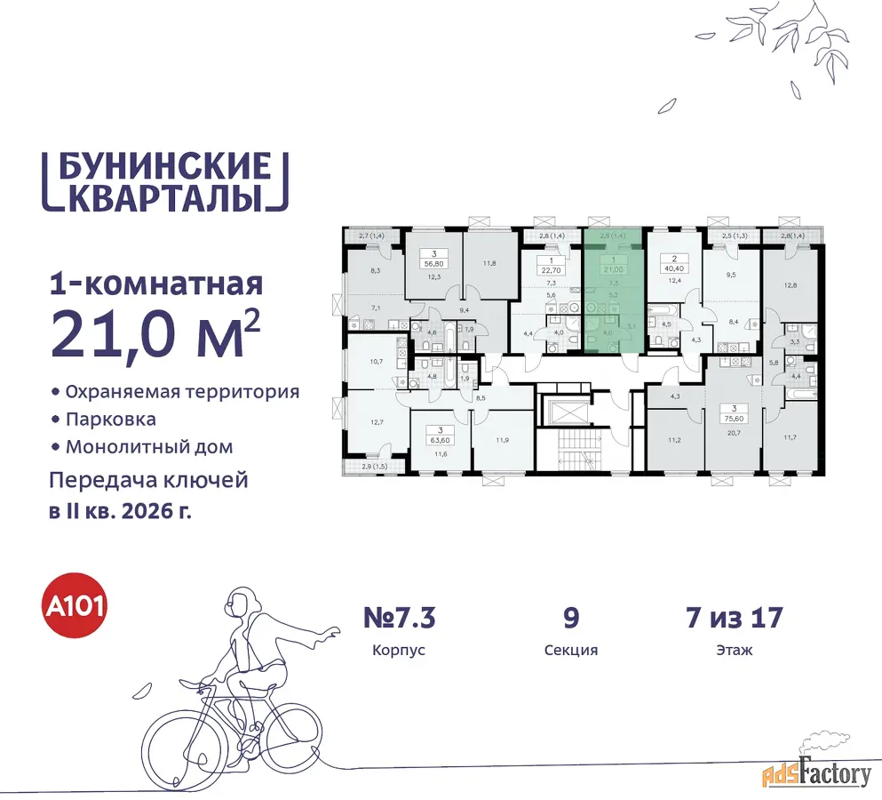 Дом монолитный, многоподъездный, переменной этажности, от 9 до 17 этажей. Квартира находится в 1-й секции высотой 9 этажей в корпусе 7.3. На этаже 6 квартир. В подъезде 1 грузовой лифт. Начало строительства - 4 квартал 2023 года. Окончание строительства - 2 квартал 2026 года. Оформление сделки по договору долевого участия.