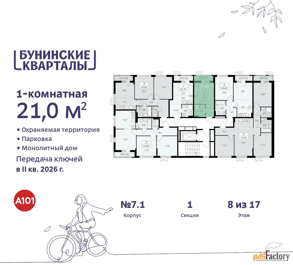 Дом монолитный, многоподъездный, переменной этажности, от 9 до 17 этажей. Квартира находится в 1-й секции высотой 9 этажей в корпусе 7.1. На этаже 6 квартир. В подъезде 1 грузовой лифт. Начало строительства - 4 квартал 2023 года. Окончание строительства - 2 квартал 2026 года. Оформление сделки по договору долевого участия.