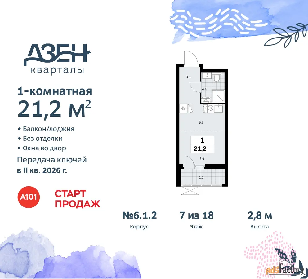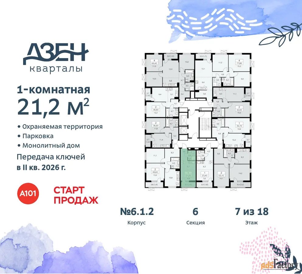 Квартира находится в корпусе 6.1.2. Дом монолитный, одноподъездный, высотой 18 этажей. На этаже 10 квартир. В подъезде 1 пассажирский и 1 грузовой лифт. Начало строительства - 4 квартал 2023 года. Окончание строительства - 2 квартал 2026 года. Оформление сделки по договору долевого участия.