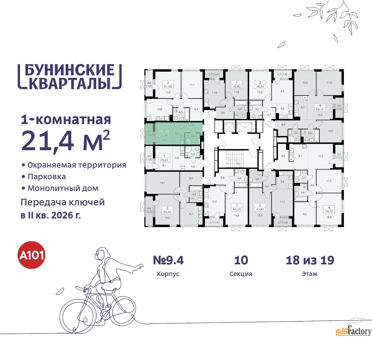 Квартира находится в корпусе 9.4. Дом монолитный, одноподъездный, высотой 19 этажей. На этаже 10 квартир. В подъезде 1 пассажирский и 1 грузовой лифт. Начало строительства - 4 квартал 2023 года. Окончание строительства - 2 квартал 2026 года. Оформление сделки по договору долевого участия.