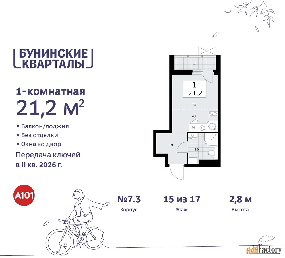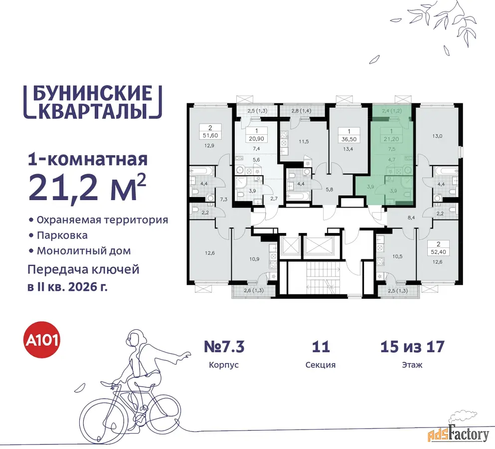 Дом монолитный, многоподъездный, переменной этажности, от 9 до 17 этажей. Квартира находится в 3-й секции высотой 17 этажей в корпусе 7.3. На этаже 5 квартир. В подъезде 1 пассажирский и 1 грузовой лифт. Начало строительства - 4 квартал 2023 года. Окончание строительства - 2 квартал 2026 года. Оформление сделки по договору долевого участия.