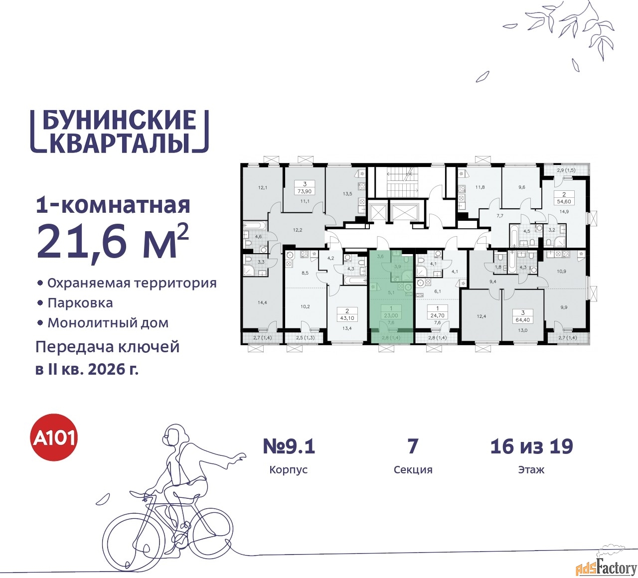 Дом монолитный, многоподъездный, переменной этажности, от 9 до 19 этажей. Квартира находится в 7-й секции высотой 19 этажей в корпусе 9.1. На этаже 6 квартир. В подъезде 1 пассажирский и 1 грузовой лифт. Начало строительства - 4 квартал 2023 года. Окончание строительства - 2 квартал 2026 года. Оформление сделки по договору долевого участия.
