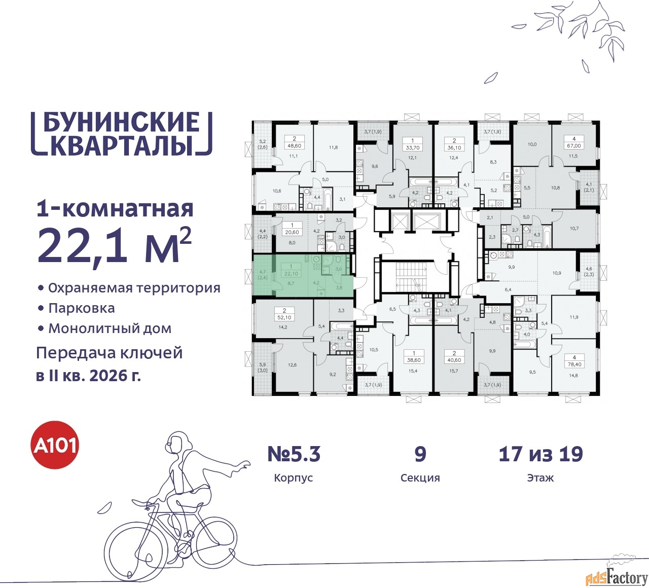 Квартира находится в корпусе 5.3. Дом монолитный, одноподъездный, высотой 19 этажей. На этаже 10 квартир. В подъезде 1 пассажирский и 1 грузовой лифт. Начало строительства - 4 квартал 2023 года. Окончание строительства - 2 квартал 2026 года. Оформление сделки по договору долевого участия.