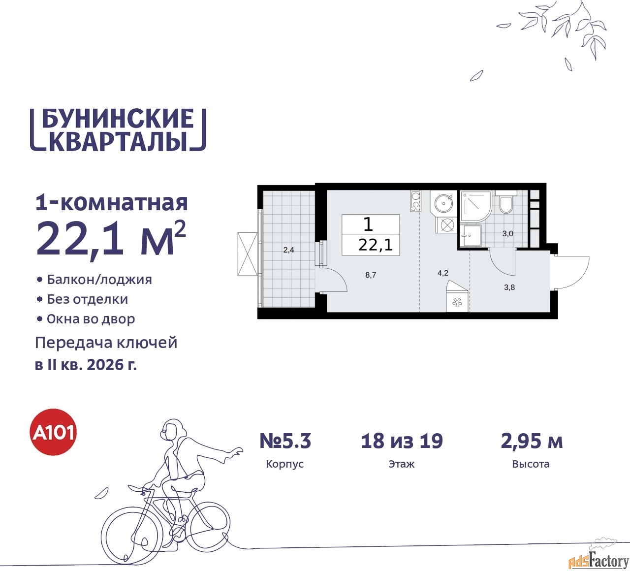 Квартира находится в корпусе 5.3. Дом монолитный, одноподъездный, высотой 19 этажей. На этаже 10 квартир. В подъезде 1 пассажирский и 1 грузовой лифт. Начало строительства - 4 квартал 2023 года. Окончание строительства - 2 квартал 2026 года. Оформление сделки по договору долевого участия.