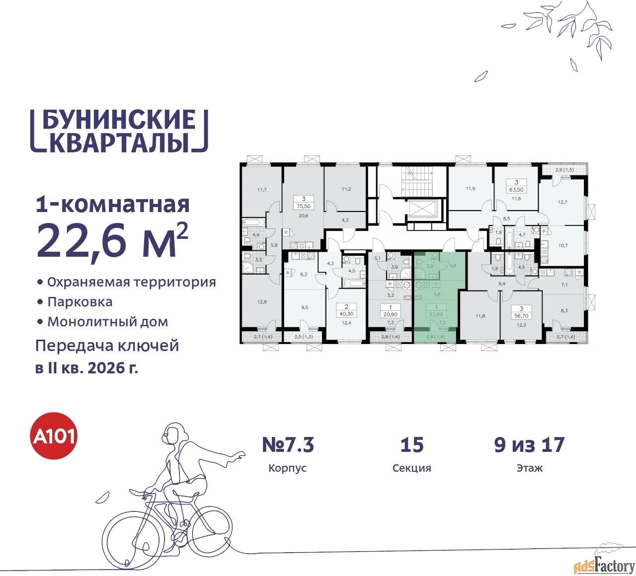 Дом монолитный, многоподъездный, переменной этажности, от 9 до 17 этажей. Квартира находится в 7-й секции высотой 9 этажей в корпусе 7.3. На этаже 6 квартир. В подъезде 1 грузовой лифт. Начало строительства - 4 квартал 2023 года. Окончание строительства - 2 квартал 2026 года. Оформление сделки по договору долевого участия.