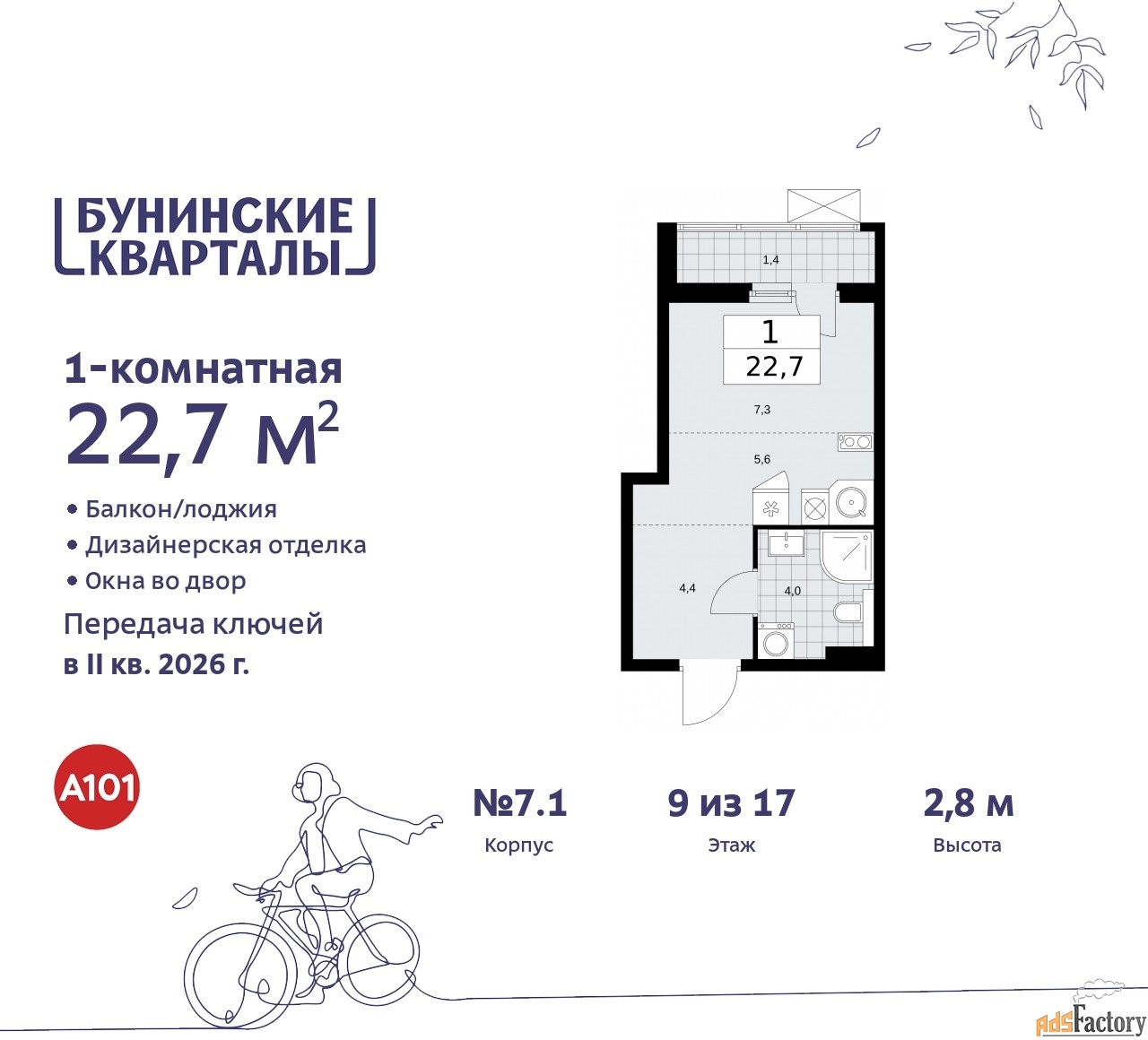 Дом монолитный, многоподъездный, переменной этажности, от 9 до 17 этажей. Квартира находится в 1-й секции высотой 9 этажей в корпусе 7.1. На этаже 6 квартир. В подъезде 1 грузовой лифт. Начало строительства - 4 квартал 2023 года. Окончание строительства - 2 квартал 2026 года. Оформление сделки по договору долевого участия.
