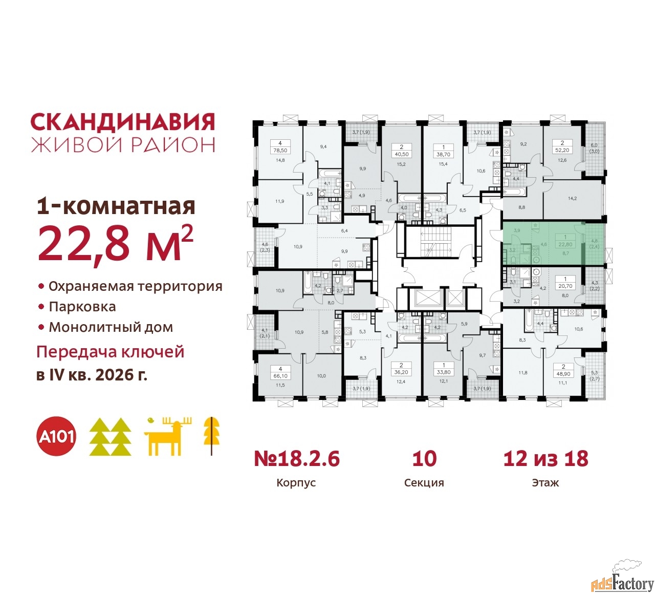 Квартира находится в корпусе 2.18.2.6. Дом монолитный, одноподъездный, высотой 18 этажей. На этаже 8 квартир. В подъезде 1 пассажирский и 1 грузовой лифт. Начало строительства - 1 квартал 2024 года. Окончание строительства - 4 квартал 2026 года. Оформление сделки по договору долевого участия.