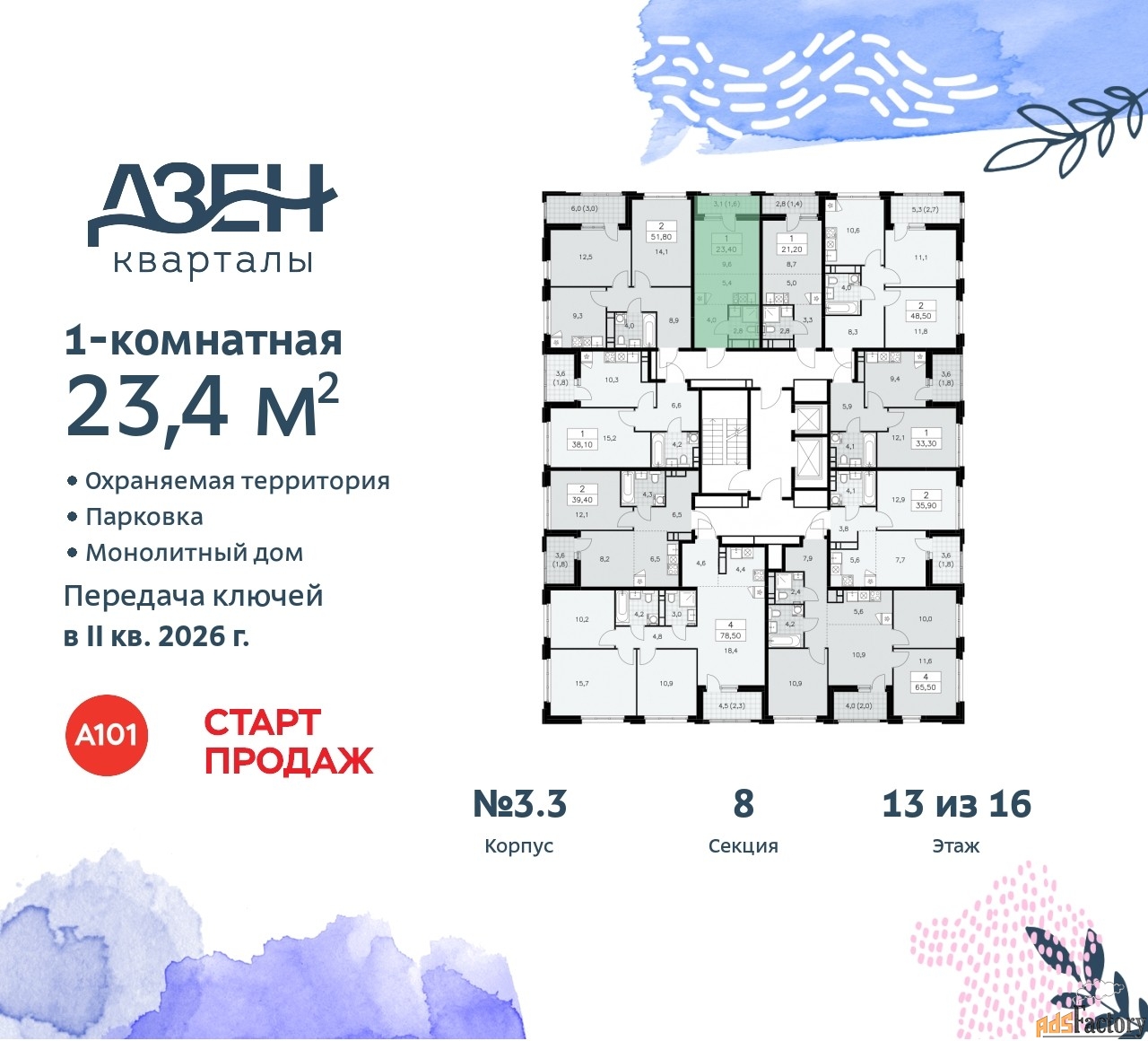 Квартира находится в корпусе 3.3. Дом монолитный, одноподъездный, высотой 16 этажей. На этаже 10 квартир. В подъезде 1 пассажирский и 1 грузовой лифт. Окончание строительства - 2 квартал 2026 года. Оформление сделки по договору долевого участия.