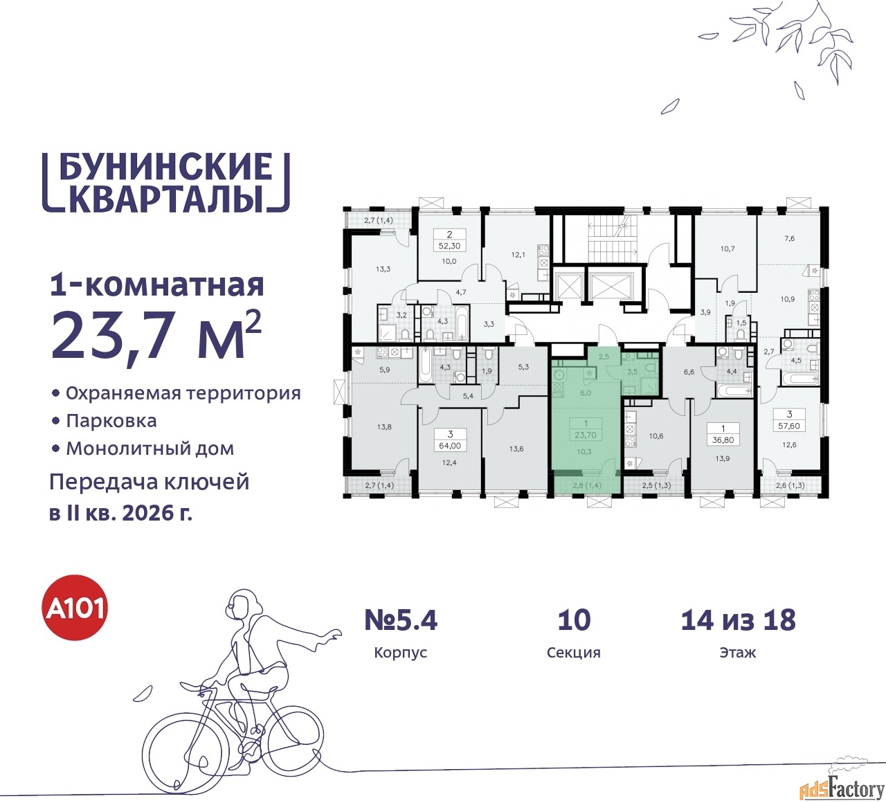Дом монолитный, черырехподъездный, переменной этажности, от 9 до 18 этажей. Квартира находится в 1-й секции высотой 18 этажей в корпусе 5.4. На этаже 5 квартир. В подъезде 1 пассажирский и 1 грузовой лифт. Начало строительства - 4 квартал 2023 года. Окончание строительства - 2 квартал 2026 года. Оформление сделки по договору долевого участия.
