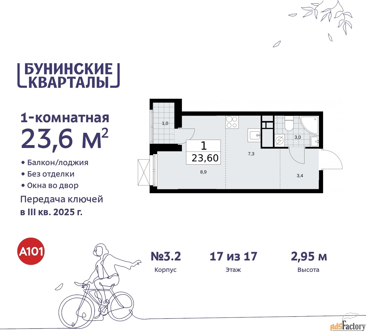Квартира находится в корпусе 3.2. Дом монолитный, одноподъездный, высотой 17 этажей. На этаже 9 квартир. В подъезде 1 пассажирский и 1 грузовой лифт. Начало строительства - 2 квартал 2023 года. Строительство окончено, дом сдан в 3 квартале 2025 года. Оформление сделки по договору купли-продажи.