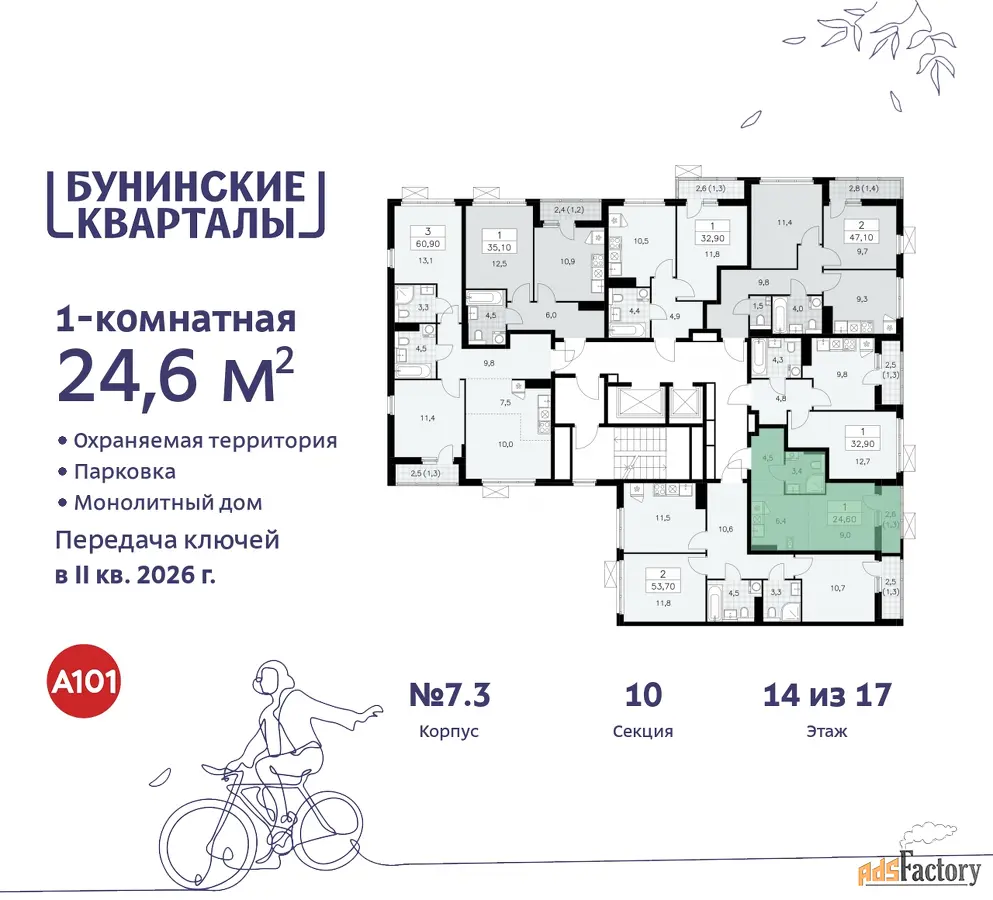 Дом монолитный, многоподъездный, переменной этажности, от 9 до 17 этажей. Квартира находится во 2-й секции высотой 17 этажей в корпусе 7.3. На этаже 7 квартир. В подъезде 1 пассажирский и 1 грузовой лифт. Начало строительства - 4 квартал 2023 года. Окончание строительства - 2 квартал 2026 года. Оформление сделки по договору долевого участия.