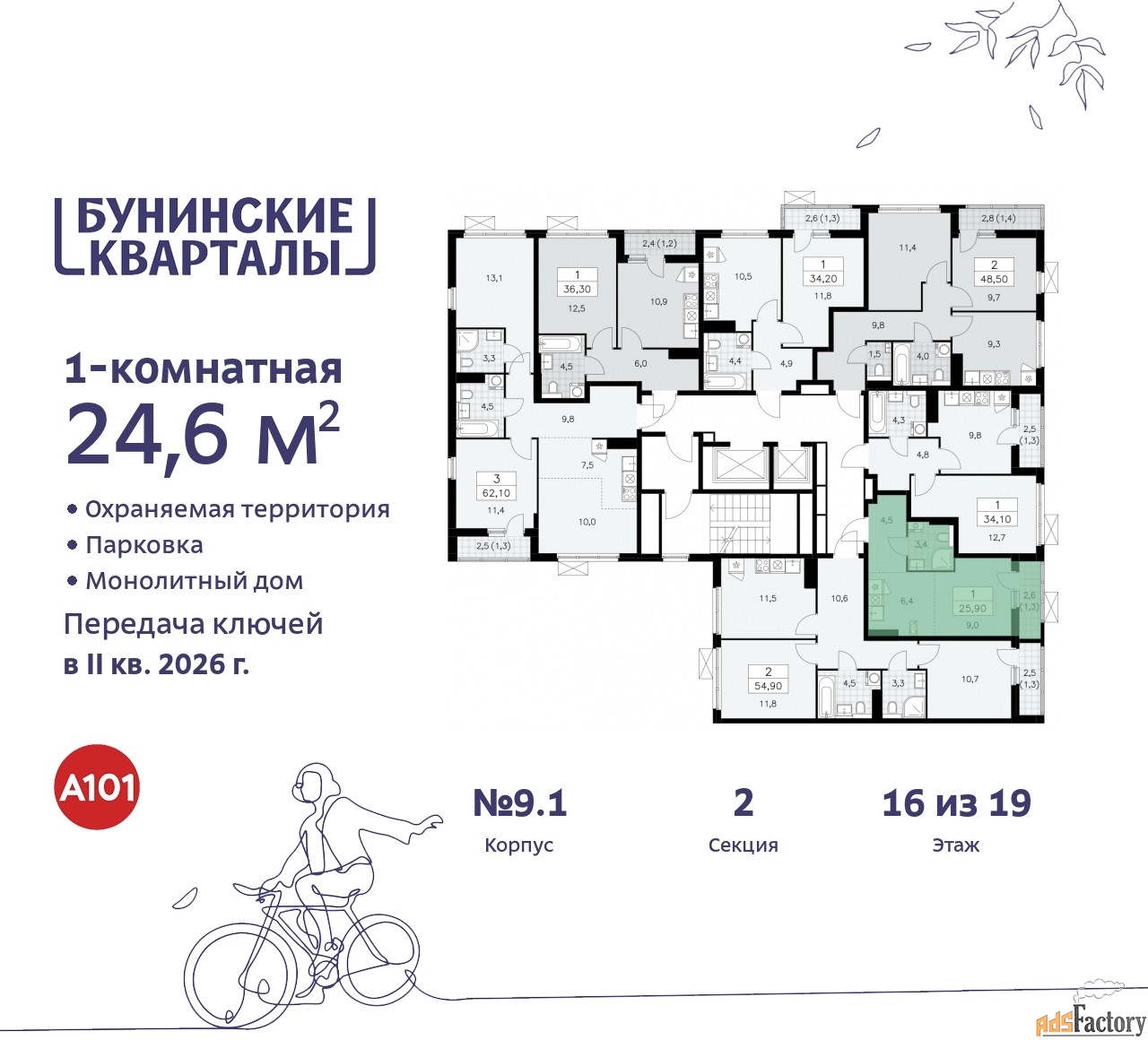 Дом монолитный, многоподъездный, переменной этажности, от 9 до 19 этажей. Квартира находится во 2-й секции высотой 17 этажей в корпусе 9.1. На этаже 7 квартир. В подъезде 1 пассажирский и 1 грузовой лифт. Начало строительства - 4 квартал 2023 года. Окончание строительства - 2 квартал 2026 года. Оформление сделки по договору долевого участия.