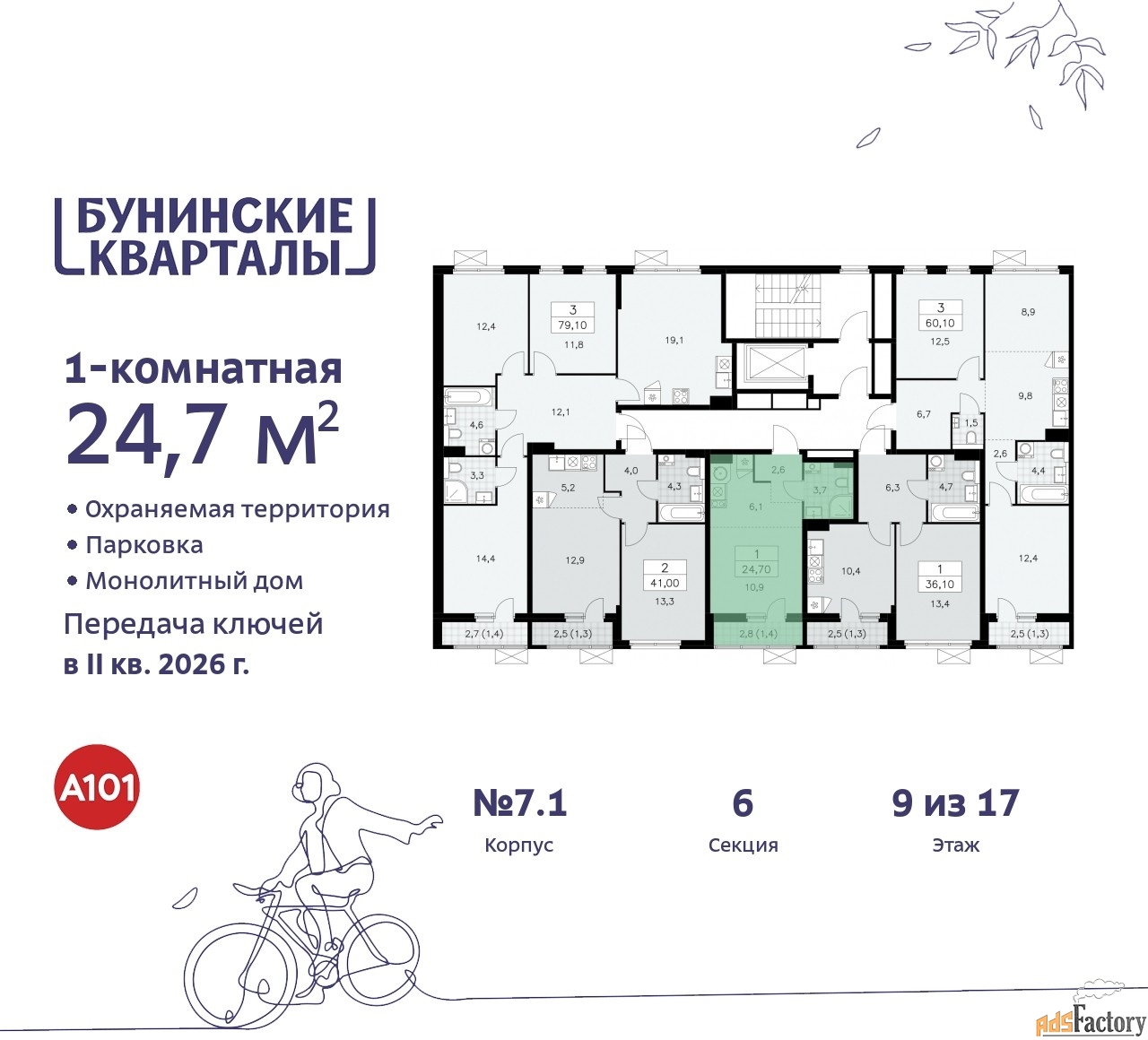 Дом монолитный, многоподъездный, переменной этажности, от 9 до 17 этажей. Квартира находится в 6-й секции высотой 9 этажей в корпусе 7.1. На этаже 5 квартир. В подъезде 1 грузовой лифт. Начало строительства - 4 квартал 2023 года. Окончание строительства - 2 квартал 2026 года. Оформление сделки по договору долевого участия.