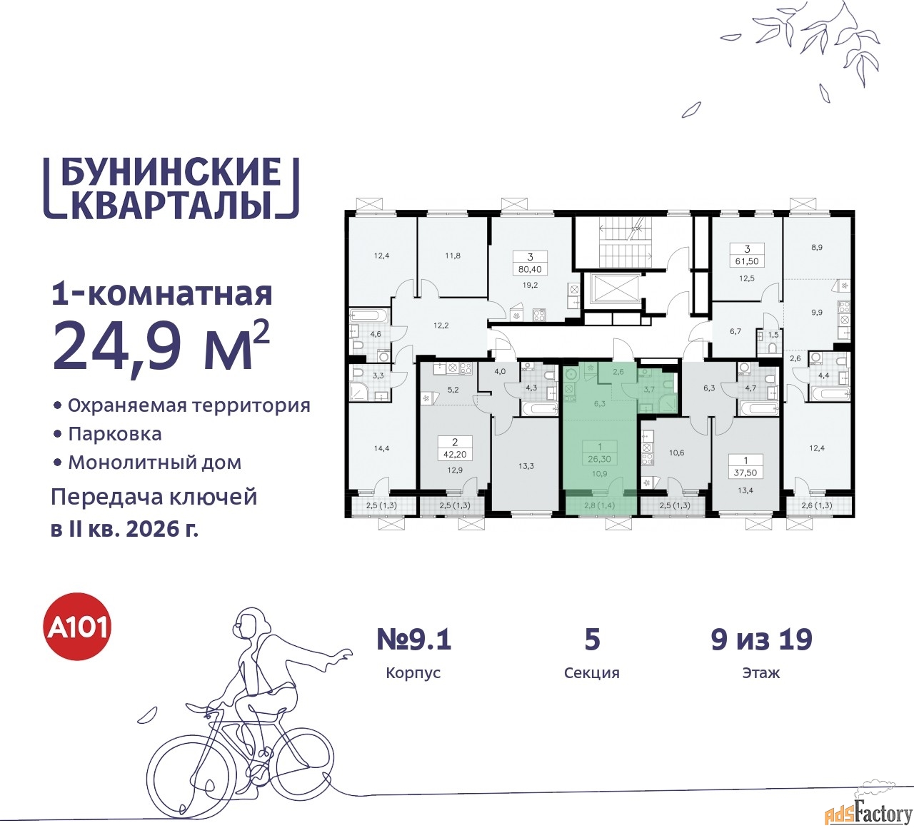 Дом монолитный, многоподъездный, переменной этажности, от 9 до 19 этажей. Квартира находится в 5-й секции высотой 9 этажей в корпусе 9.1. На этаже 5 квартир. В подъезде 1 грузовой лифт. Начало строительства - 4 квартал 2023 года. Окончание строительства - 2 квартал 2026 года. Оформление сделки по договору долевого участия.