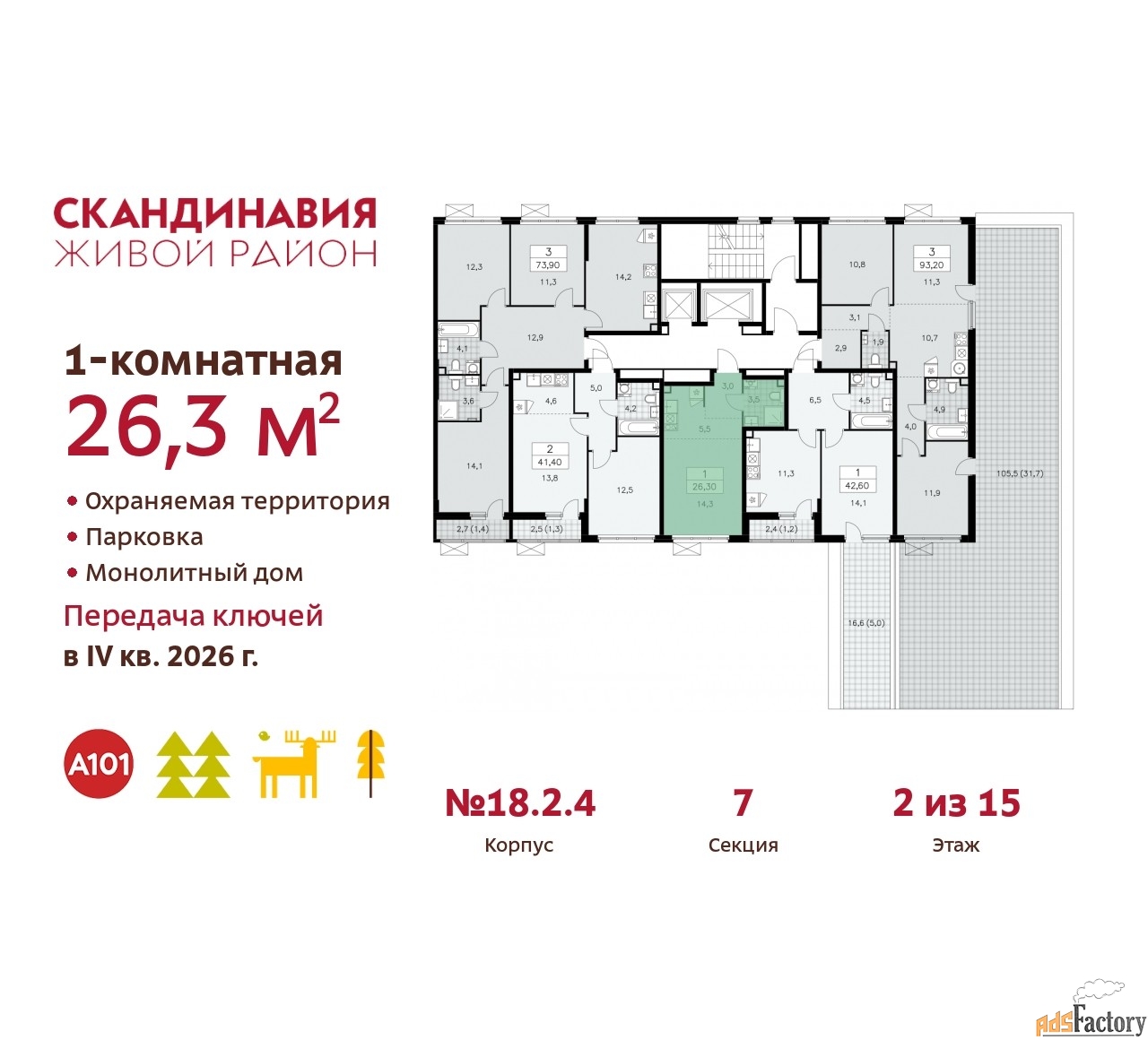 Дом монолитный, двухподъездный, переменной этажности, от 9 до 15 этажей. Квартира находится во 2-й секции высотой 15 этажей в корпусе 2.18.2.4. На этаже 5 квартир. В подъезде 1 пассажирский и 1 грузовой лифт. Начало строительства - 1 квартал 2024 года. Окончание строительства - 4 квартал 2026 года. Оформление сделки по договору долевого участия.