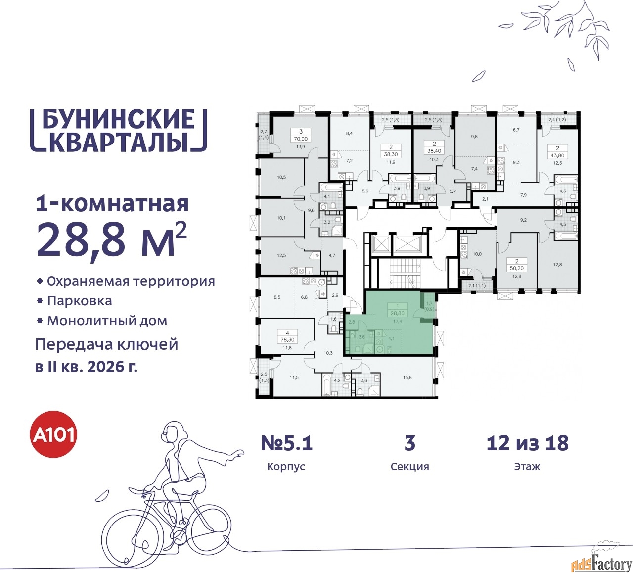 Дом монолитный, многоподъездный, переменной этажности, от 9 до 18 этажей. Квартира находится в 3-й секции высотой 18 этажей в корпусе 5.1. На этаже 7 квартир. В подъезде 1 пассажирский и 1 грузовой лифт. Начало строительства - 4 квартал 2023 года. Окончание строительства - 2 квартал 2026 года. Оформление сделки по договору долевого участия.