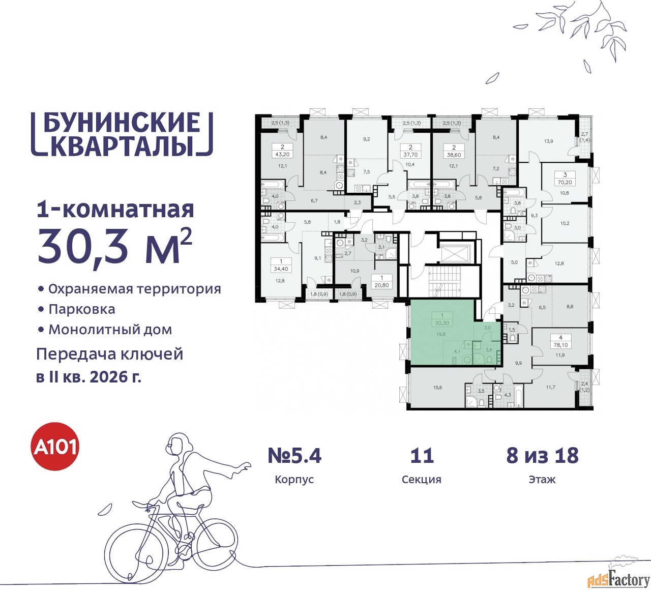 Дом монолитный, черырехподъездный, переменной этажности, от 9 до 18 этажей. Квартира находится во 2-й секции высотой 9 этажей в корпусе 5.4. На этаже 8 квартир. В подъезде 1 грузовой лифт. Начало строительства - 4 квартал 2023 года. Окончание строительства - 2 квартал 2026 года. Оформление сделки по договору долевого участия.