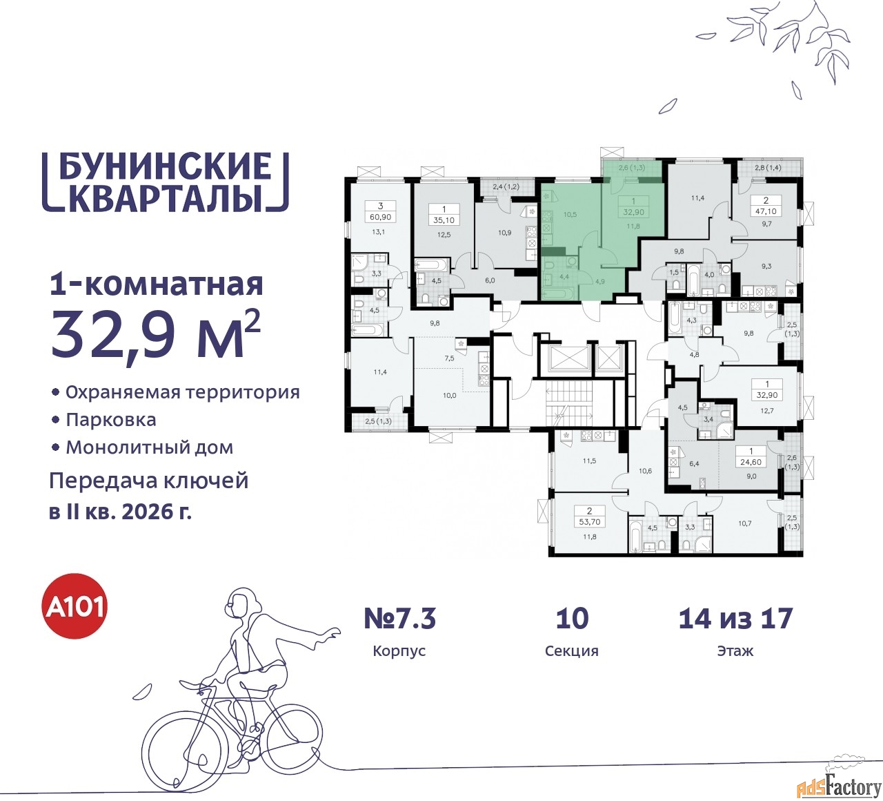 Дом монолитный, многоподъездный, переменной этажности, от 9 до 17 этажей. Квартира находится во 2-й секции высотой 17 этажей в корпусе 7.3. На этаже 7 квартир. В подъезде 1 пассажирский и 1 грузовой лифт. Начало строительства - 4 квартал 2023 года. Окончание строительства - 2 квартал 2026 года. Оформление сделки по договору долевого участия.