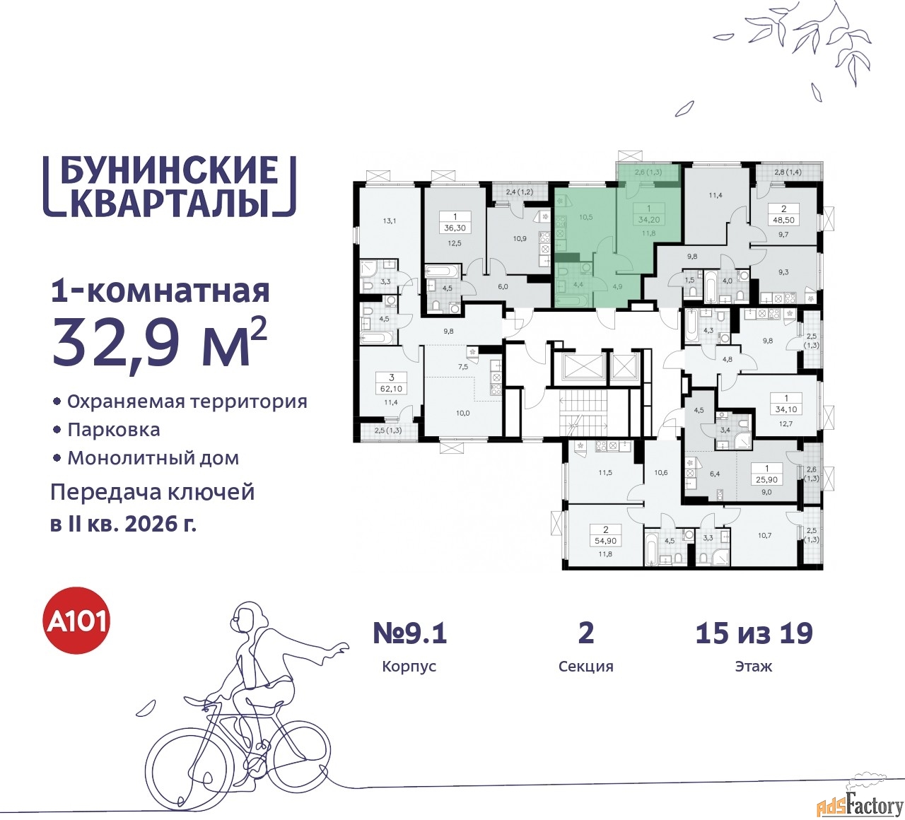 Дом монолитный, многоподъездный, переменной этажности, от 9 до 19 этажей. Квартира находится во 2-й секции высотой 17 этажей в корпусе 9.1. На этаже 7 квартир. В подъезде 1 пассажирский и 1 грузовой лифт. Начало строительства - 4 квартал 2023 года. Окончание строительства - 2 квартал 2026 года. Оформление сделки по договору долевого участия.