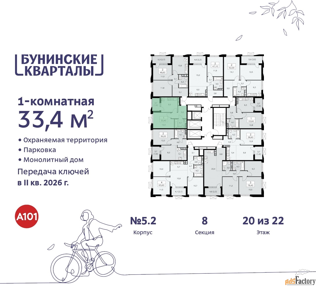 Квартира находится в корпусе 5.2. Дом монолитный, одноподъездный, высотой 22 этажа. На этаже 9 квартир. В подъезде 1 пассажирский и 2 грузовых лифта. Начало строительства - 4 квартал 2023 года. Окончание строительства - 2 квартал 2026 года. Оформление сделки по договору долевого участия.