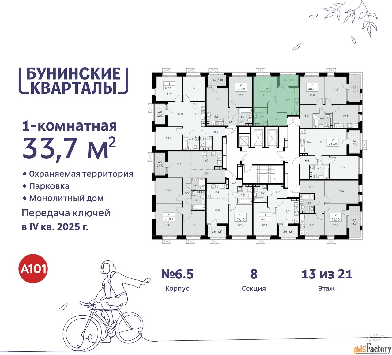 Квартира находится в корпусе 6.5. Дом монолитный, одноподъездный, высотой 21 этаж. На этаже 9 квартир. В подъезде 1 пассажирский и 2 грузовых лифта. Начало строительства - 3 квартал 2023 года. Окончание строительства - 2 квартал 2026 года. Оформление сделки по договору долевого участия.
