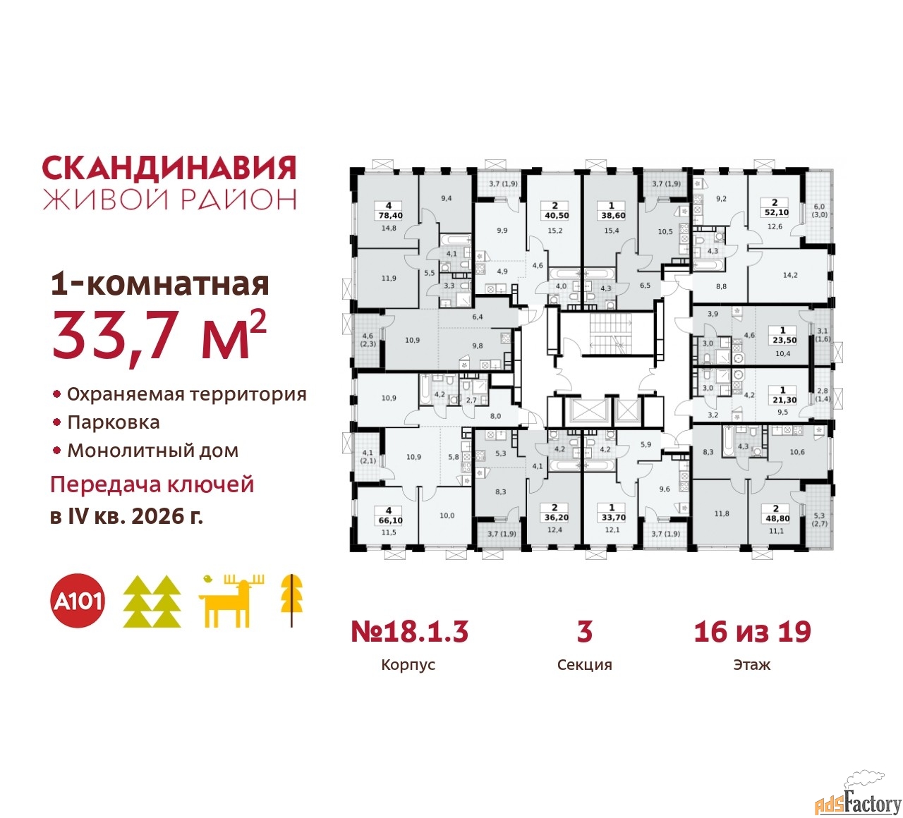 Квартира находится в корпусе 2.18.1.3. Дом монолитный, одноподъездный, высотой 19 этажей. На этаже 10 квартир. В подъезде 1 пассажирский и 1 грузовой лифт. Начало строительства - 1 квартал 2024 года. Окончание строительства - 4 квартал 2026 года. Оформление сделки по договору долевого участия.