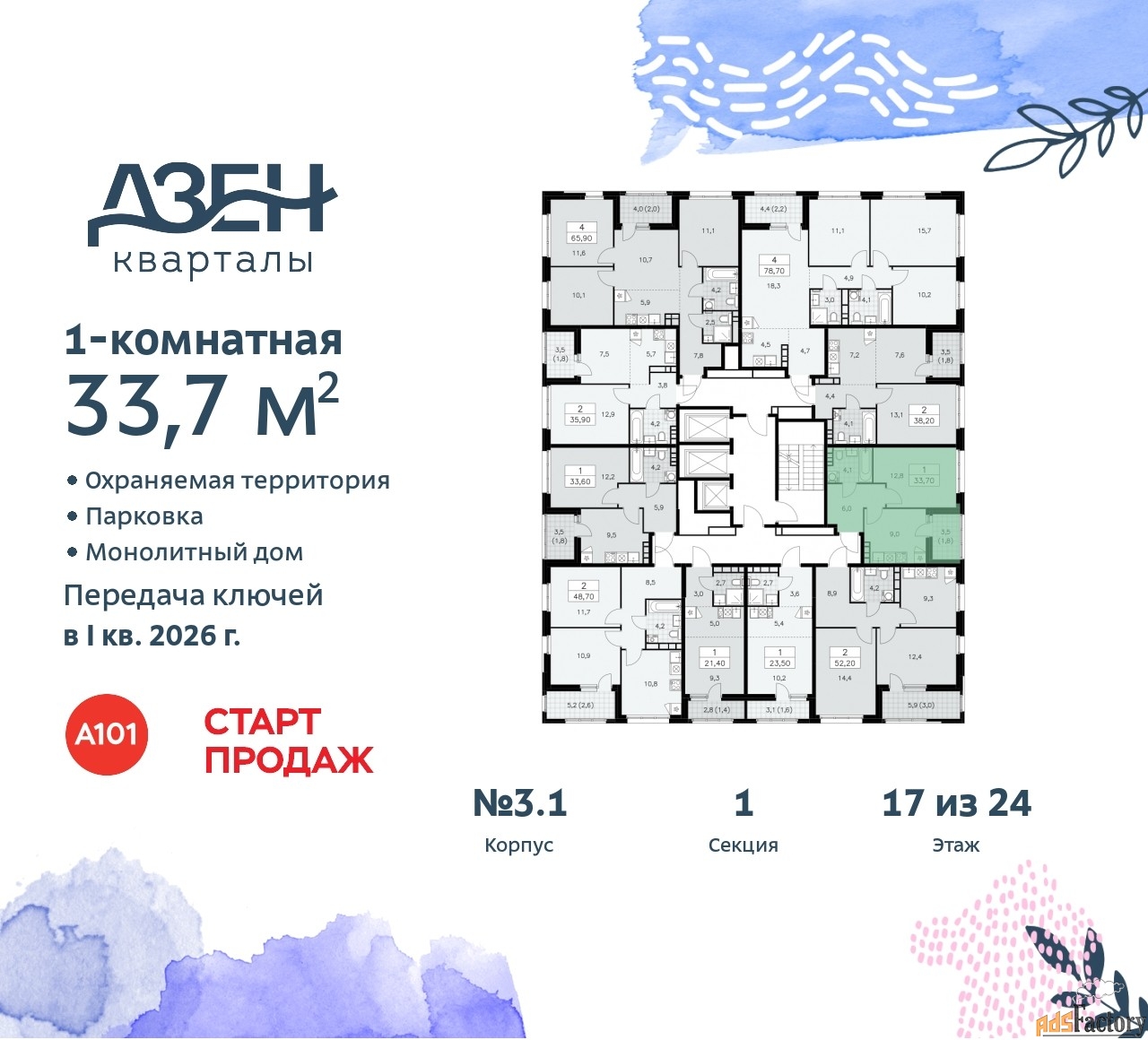 Квартира находится в корпусе 3.1. Дом монолитный, одноподъездный, высотой 24 этажа. На этаже 10 квартир. В подъезде 1 пассажирский и 2 грузовых лифта. Начало строительства - 3 квартал 2023 года. Окончание строительства - 1 квартал 2026 года. Оформление сделки по договору долевого участия.