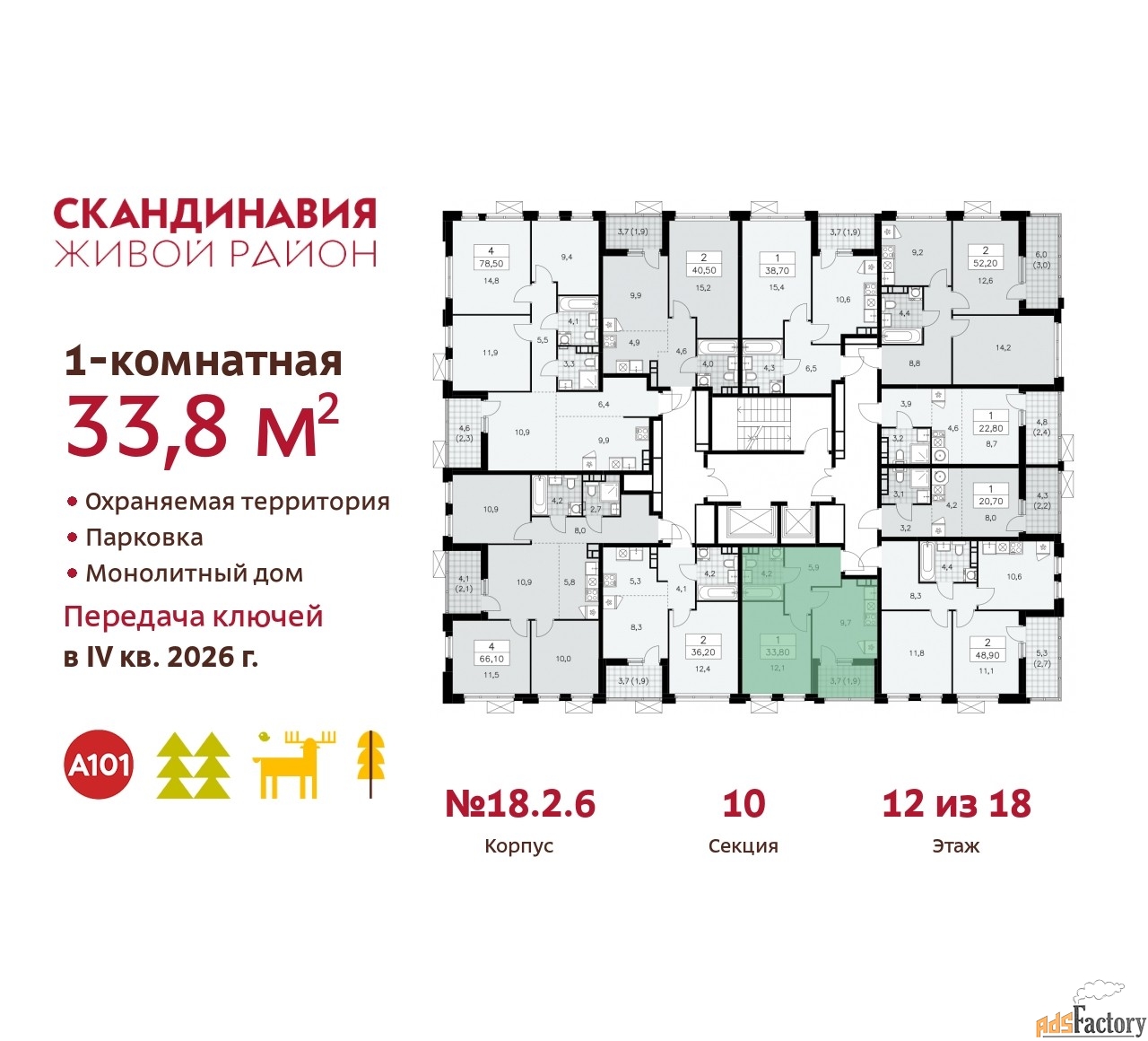 Квартира находится в корпусе 2.18.2.6. Дом монолитный, одноподъездный, высотой 18 этажей. На этаже 8 квартир. В подъезде 1 пассажирский и 1 грузовой лифт. Начало строительства - 1 квартал 2024 года. Окончание строительства - 4 квартал 2026 года. Оформление сделки по договору долевого участия.