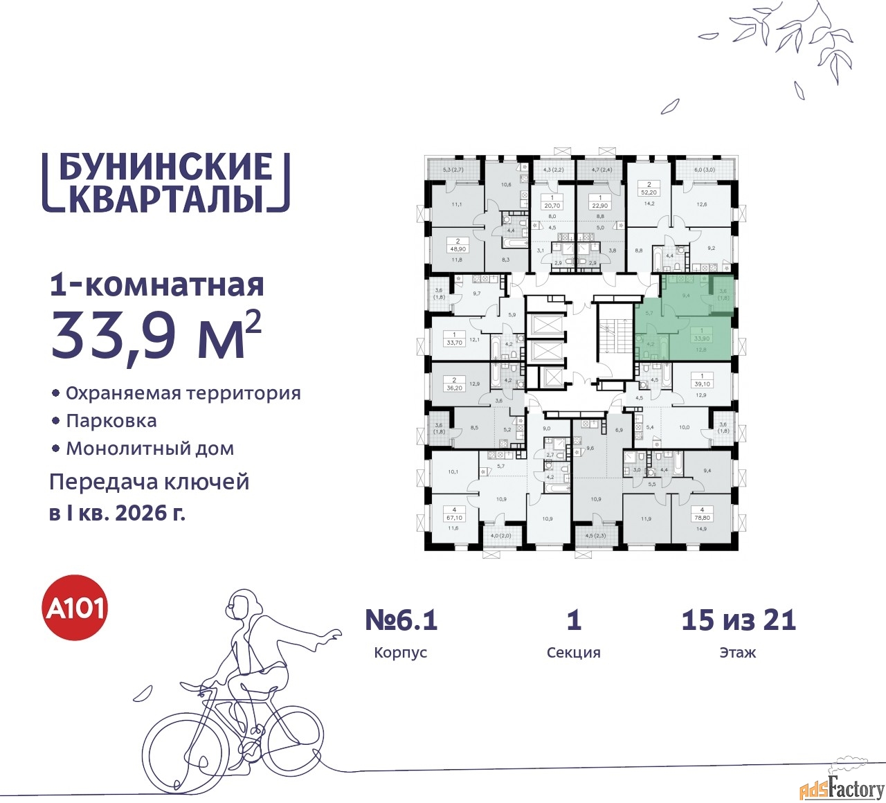 Квартира находится в корпусе 6.1. Дом монолитный, одноподъездный, высотой 21 этаж. На этаже 10 квартир. В подъезде 1 пассажирский и 2 грузовых лифта. Начало строительства - 3 квартал 2023 года. Окончание строительства - 1 квартал 2026 года. Оформление сделки по договору долевого участия.