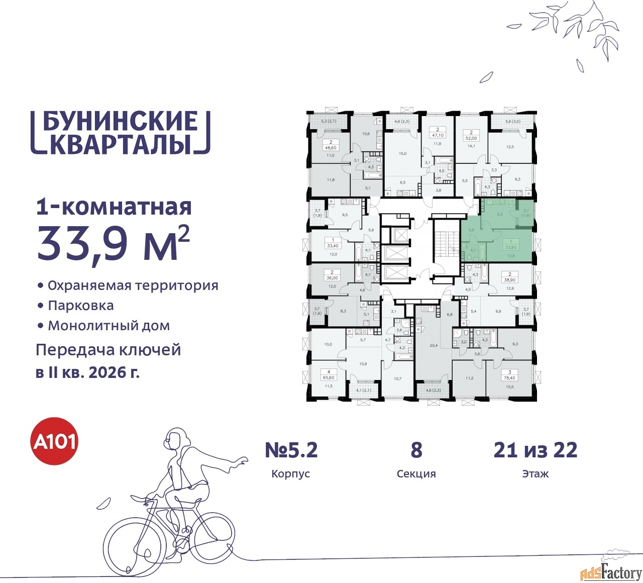 Квартира находится в корпусе 5.2. Дом монолитный, одноподъездный, высотой 22 этажа. На этаже 9 квартир. В подъезде 1 пассажирский и 2 грузовых лифта. Начало строительства - 4 квартал 2023 года. Окончание строительства - 2 квартал 2026 года. Оформление сделки по договору долевого участия.