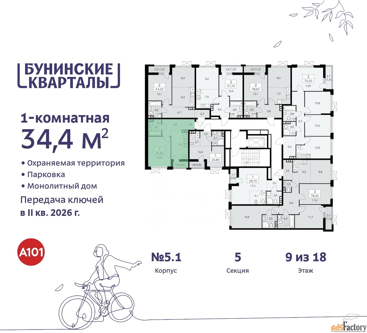 Дом монолитный, многоподъездный, переменной этажности, от 9 до 18 этажей. Квартира находится в 5-й секции высотой 9 этажей в корпусе 5.1. На этаже 8 квартир. В подъезде 1 грузовой лифт. Начало строительства - 4 квартал 2023 года. Окончание строительства - 2 квартал 2026 года. Оформление сделки по договору долевого участия.