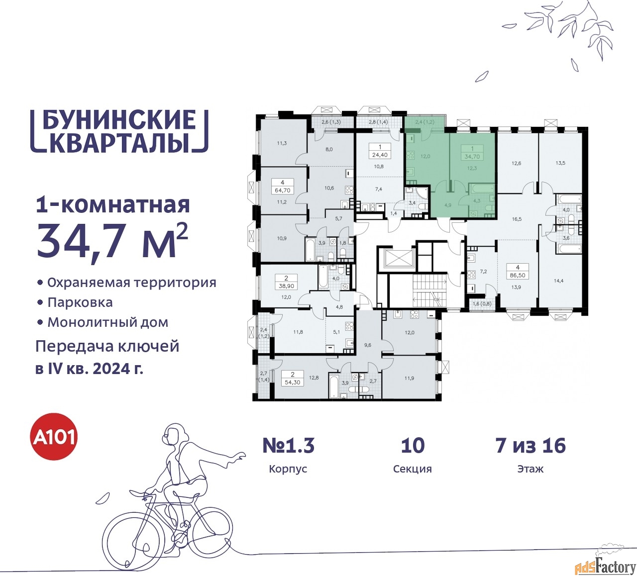 Дом монолитный, многоподъездный, переменной этажности, от 9 до 16 этажей. Квартира находится в 5-й секции высотой 9 этажей в корпусе 1.3. На этаже 6 квартир. В подъезде 1 грузовой лифт. Начало строительства - 3 квартал 2022 года. Строительство окончено, дом сдан в 1 квартале 2025 года. Оформление сделки по договору купли-продажи.