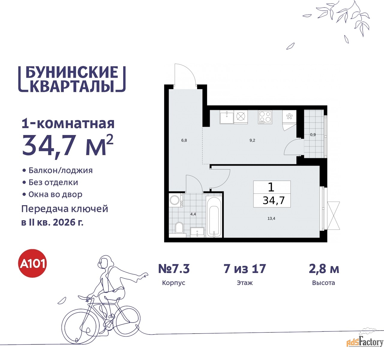 Дом монолитный, многоподъездный, переменной этажности, от 9 до 17 этажей. Квартира находится в 4-й секции высотой 9 этажей в корпусе 7.3. На этаже 8 квартир. В подъезде 1 грузовой лифт. Начало строительства - 4 квартал 2023 года. Окончание строительства - 2 квартал 2026 года. Оформление сделки по договору долевого участия.