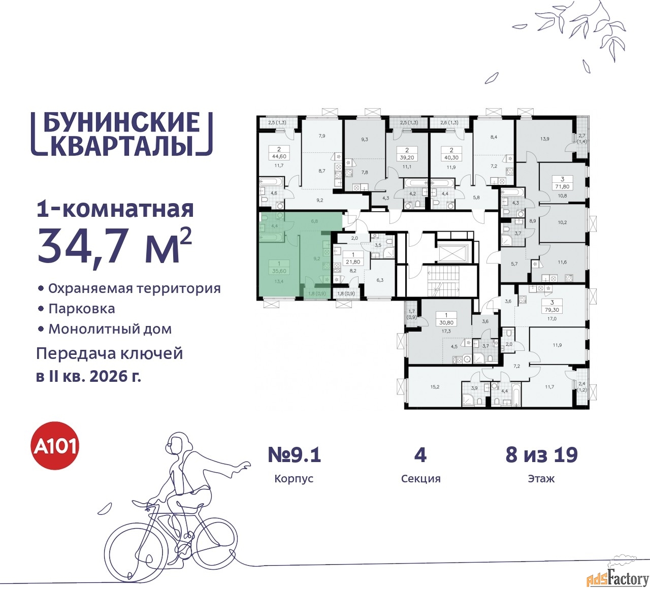 Дом монолитный, многоподъездный, переменной этажности, от 9 до 19 этажей. Квартира находится в 4-й секции высотой 9 этажей в корпусе 9.1. На этаже 8 квартир. В подъезде 1 грузовой лифт. Начало строительства - 4 квартал 2023 года. Окончание строительства - 2 квартал 2026 года. Оформление сделки по договору долевого участия.