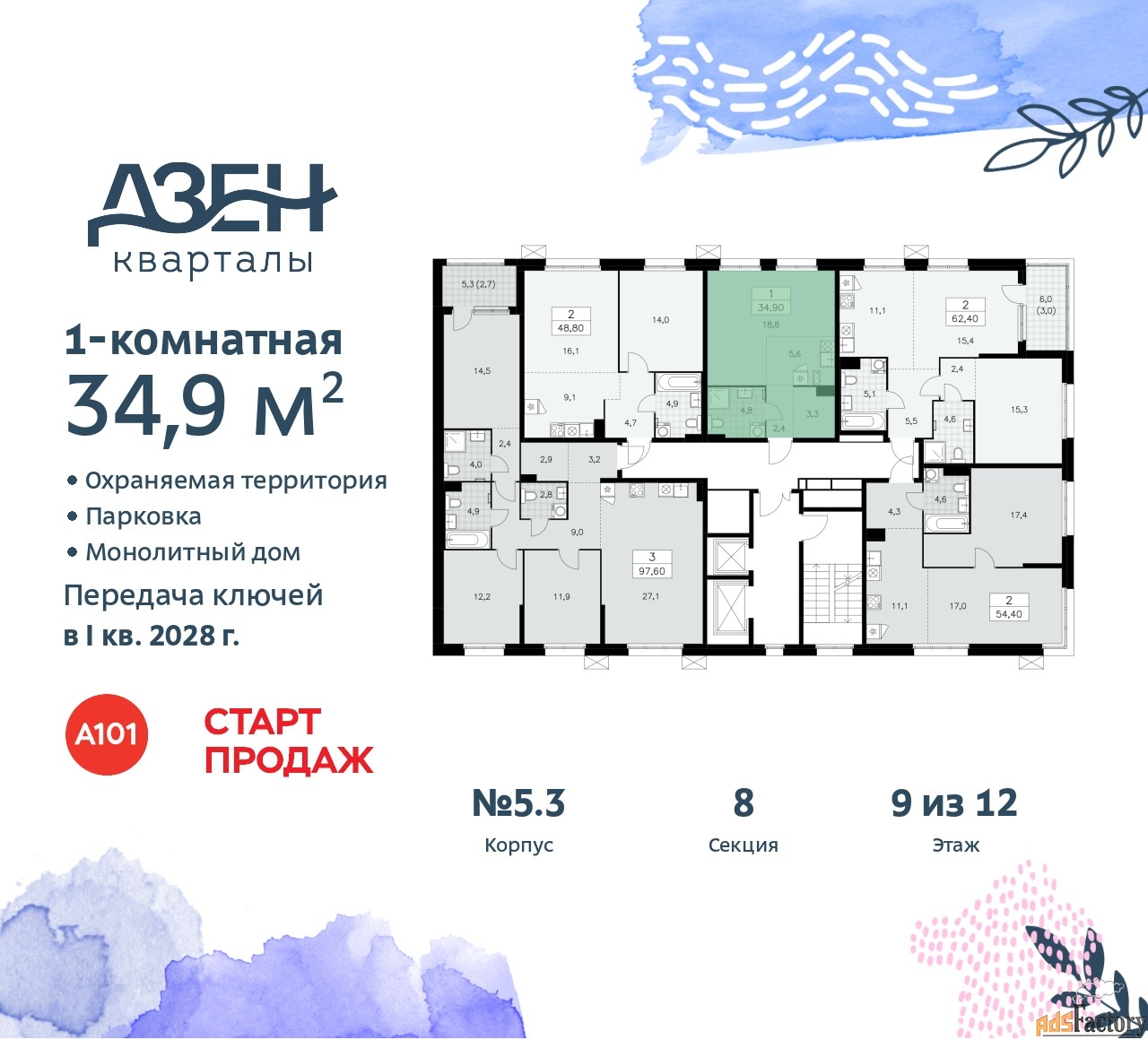 Дом монолитный, трехподъездный, переменной этажности, от 8 до 12 этажей. Квартира находится в 3-й секции высотой 12 этажей в корпусе бизнес-класса 5.3. На этаже 5 квартир. В подъезде 1 пассажирский и 1 грузовой лифт. Начало строительства - 3 квартал 2025 года. Окончание строительства - 1 квартал 2028 года. Оформление сделки по договору долевого участия.