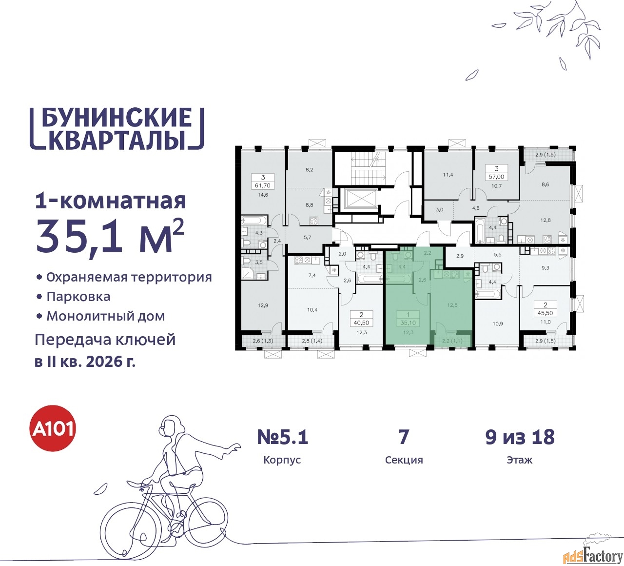 Дом монолитный, многоподъездный, переменной этажности, от 9 до 18 этажей. Квартира находится в 7-й секции высотой 9 этажей в корпусе 5.1. На этаже 5 квартир. В подъезде 1 грузовой лифт. Начало строительства - 4 квартал 2023 года. Окончание строительства - 2 квартал 2026 года. Оформление сделки по договору долевого участия.