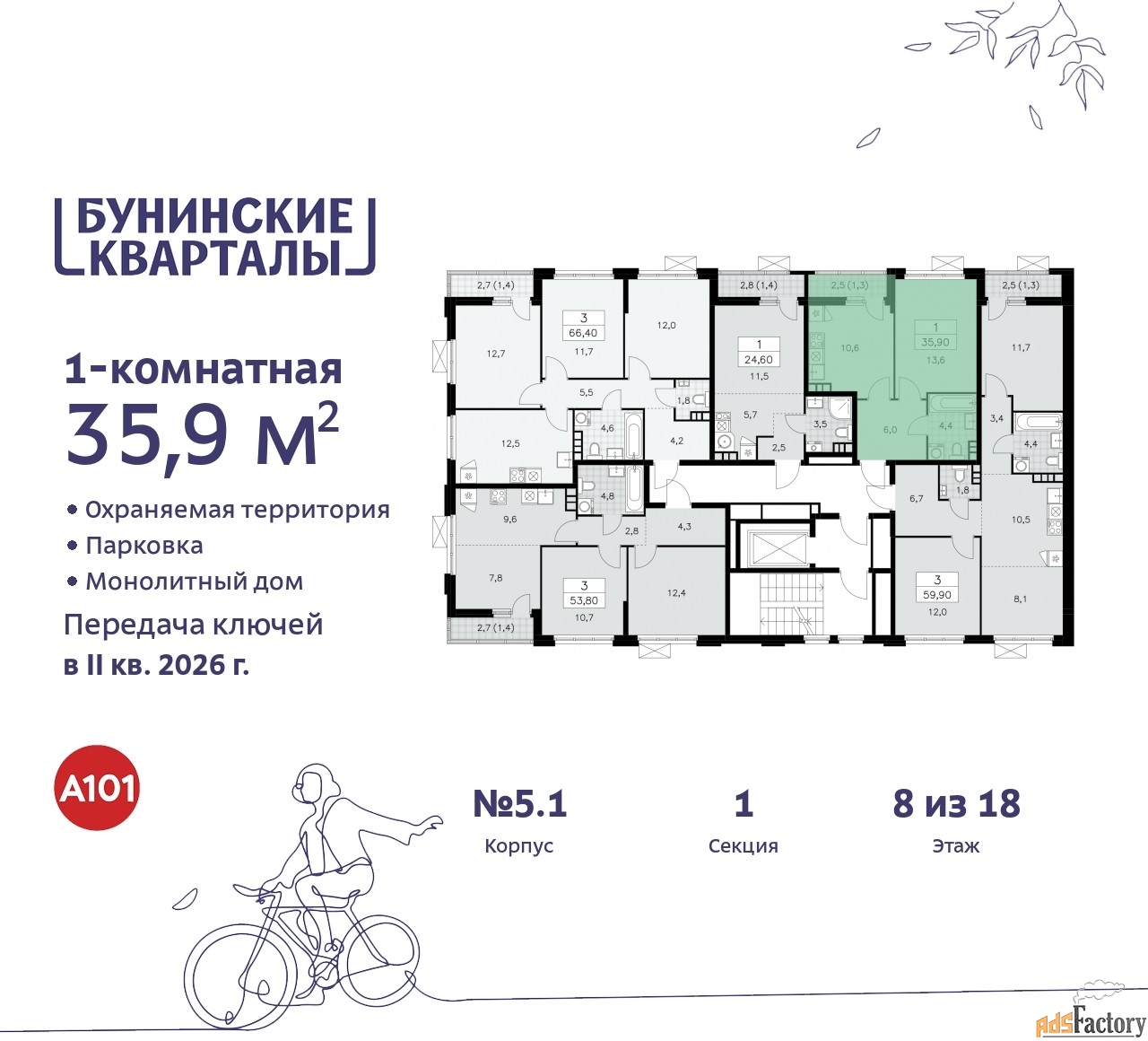 Дом монолитный, многоподъездный, переменной этажности, от 9 до 18 этажей. Квартира находится в 1-й секции высотой 9 этажей в корпусе 5.1. На этаже 5 квартир. В подъезде 1 грузовой лифт. Начало строительства - 4 квартал 2023 года. Окончание строительства - 2 квартал 2026 года. Оформление сделки по договору долевого участия.