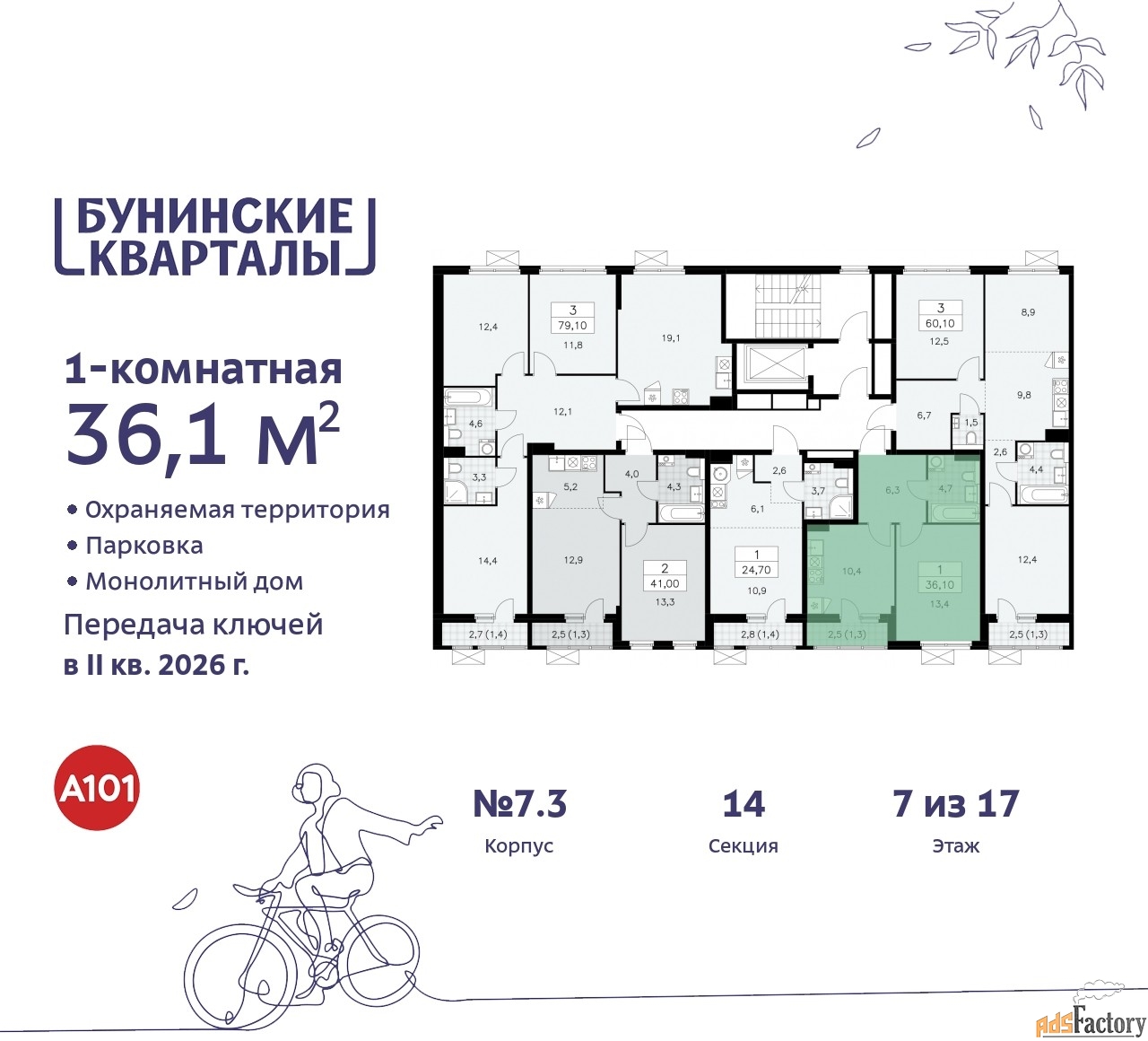 Дом монолитный, многоподъездный, переменной этажности, от 9 до 17 этажей. Квартира находится в 6-й секции высотой 9 этажей в корпусе 7.3. На этаже 5 квартир. В подъезде 1 грузовой лифт. Начало строительства - 4 квартал 2023 года. Окончание строительства - 2 квартал 2026 года. Оформление сделки по договору долевого участия.