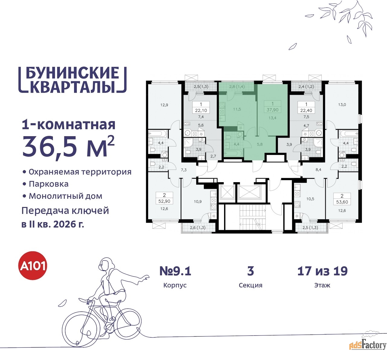 Дом монолитный, многоподъездный, переменной этажности, от 9 до 19 этажей. Квартира находится в 3-й секции высотой 17 этажей в корпусе 9.1. На этаже 5 квартир. В подъезде 1 пассажирский и 1 грузовой лифт. Начало строительства - 4 квартал 2023 года. Окончание строительства - 2 квартал 2026 года. Оформление сделки по договору долевого участия.