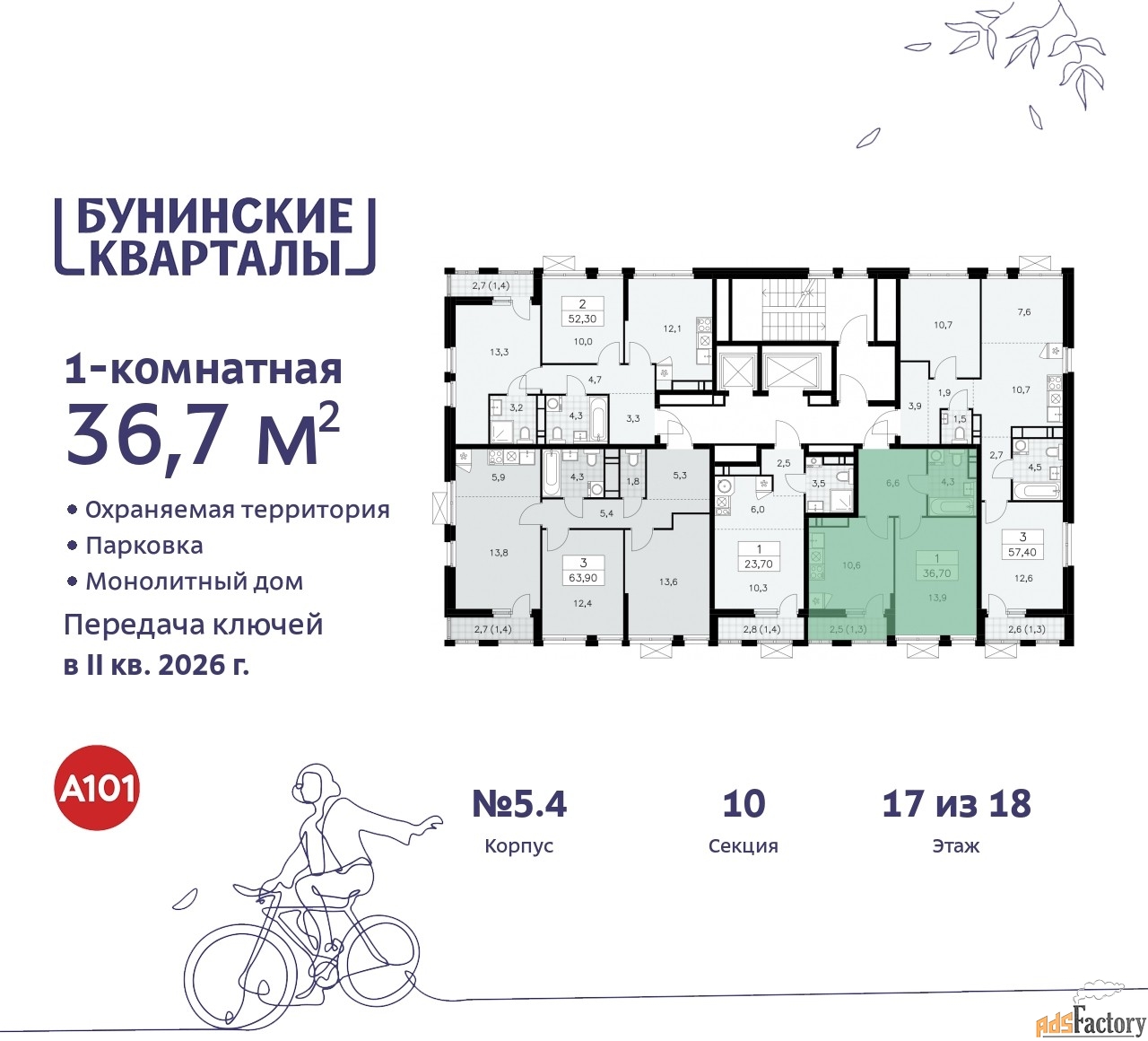 Дом монолитный, черырехподъездный, переменной этажности, от 9 до 18 этажей. Квартира находится в 1-й секции высотой 18 этажей в корпусе 5.4. На этаже 5 квартир. В подъезде 1 пассажирский и 1 грузовой лифт. Начало строительства - 4 квартал 2023 года. Окончание строительства - 2 квартал 2026 года. Оформление сделки по договору долевого участия.