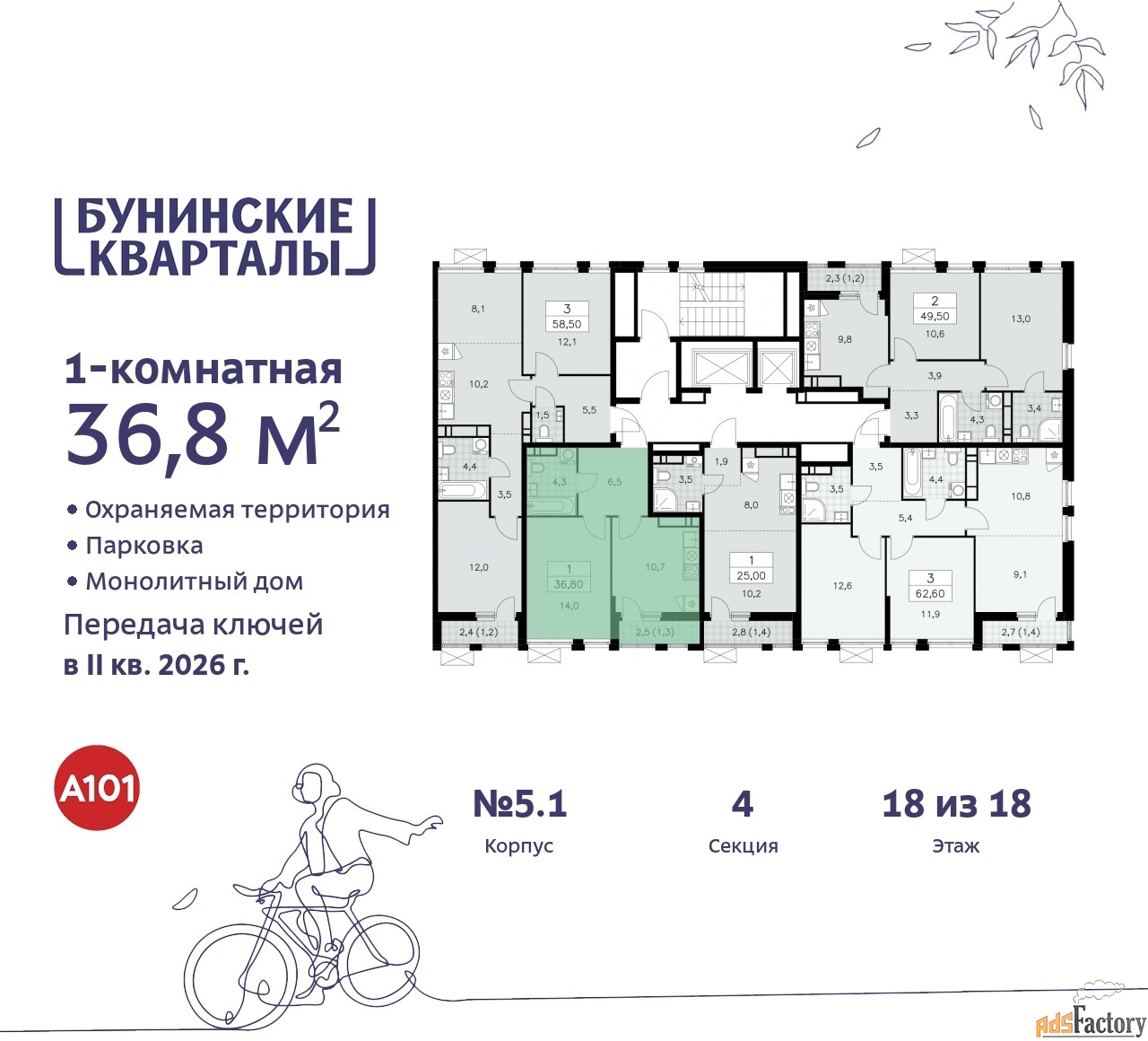 Дом монолитный, многоподъездный, переменной этажности, от 9 до 18 этажей. Квартира находится в 4-й секции высотой 18 этажей в корпусе 5.1. На этаже 5 квартир. В подъезде 1 пассажирский и 1 грузовой лифт. Начало строительства - 4 квартал 2023 года. Окончание строительства - 2 квартал 2026 года. Оформление сделки по договору долевого участия.