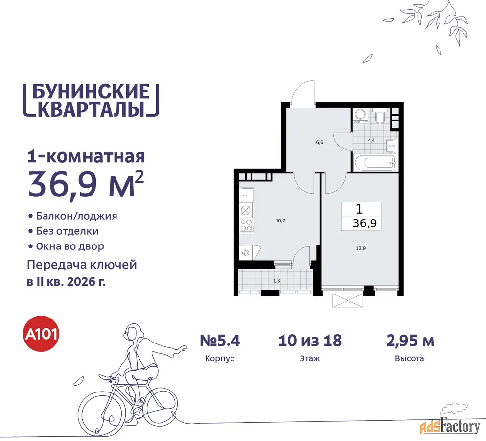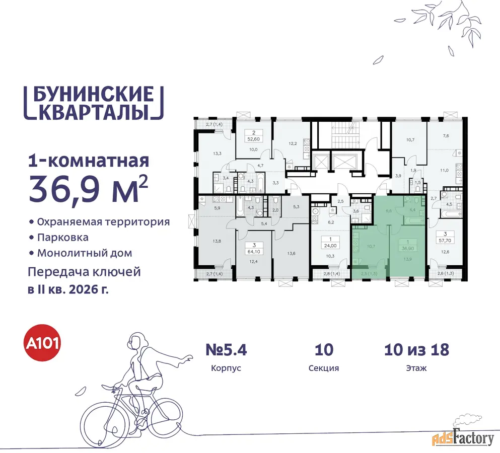 Дом монолитный, черырехподъездный, переменной этажности, от 9 до 18 этажей. Квартира находится в 1-й секции высотой 18 этажей в корпусе 5.4. На этаже 5 квартир. В подъезде 1 пассажирский и 1 грузовой лифт. Начало строительства - 4 квартал 2023 года. Окончание строительства - 2 квартал 2026 года. Оформление сделки по договору долевого участия.