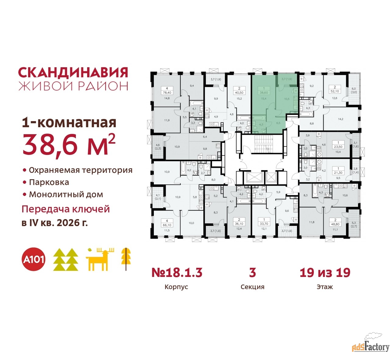 Квартира находится в корпусе 2.18.1.3. Дом монолитный, одноподъездный, высотой 19 этажей. На этаже 10 квартир. В подъезде 1 пассажирский и 1 грузовой лифт. Начало строительства - 1 квартал 2024 года. Окончание строительства - 4 квартал 2026 года. Оформление сделки по договору долевого участия.