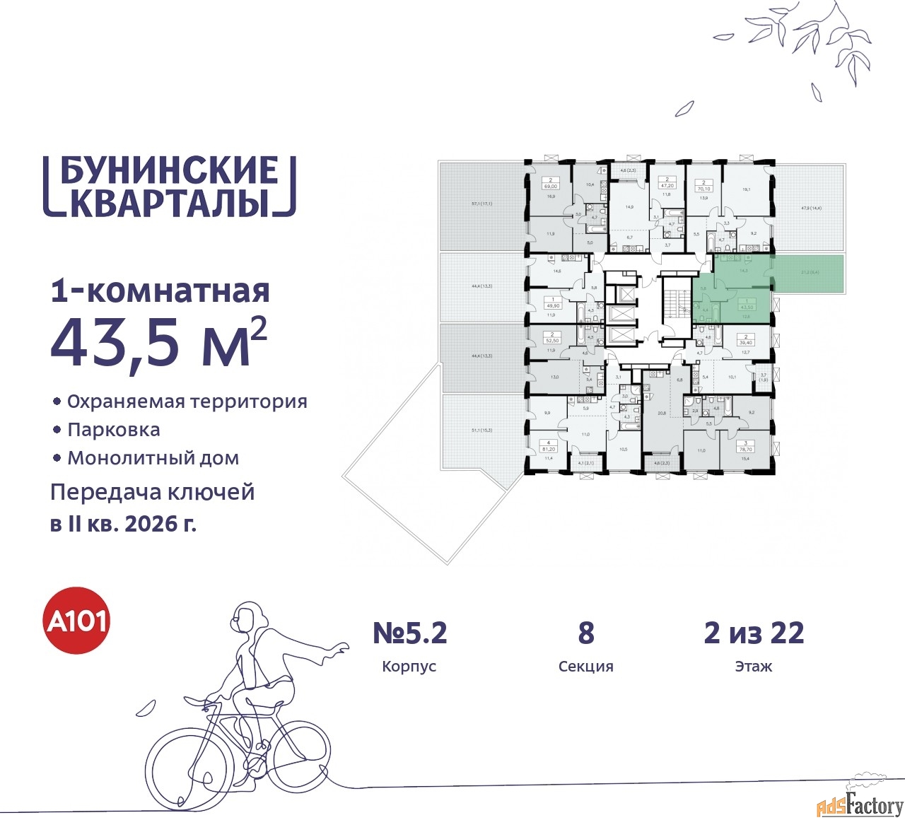 Квартира находится в корпусе 5.2. Дом монолитный, одноподъездный, высотой 22 этажа. На этаже 9 квартир. В подъезде 1 пассажирский и 2 грузовых лифта. Начало строительства - 4 квартал 2023 года. Окончание строительства - 2 квартал 2026 года. Оформление сделки по договору долевого участия.