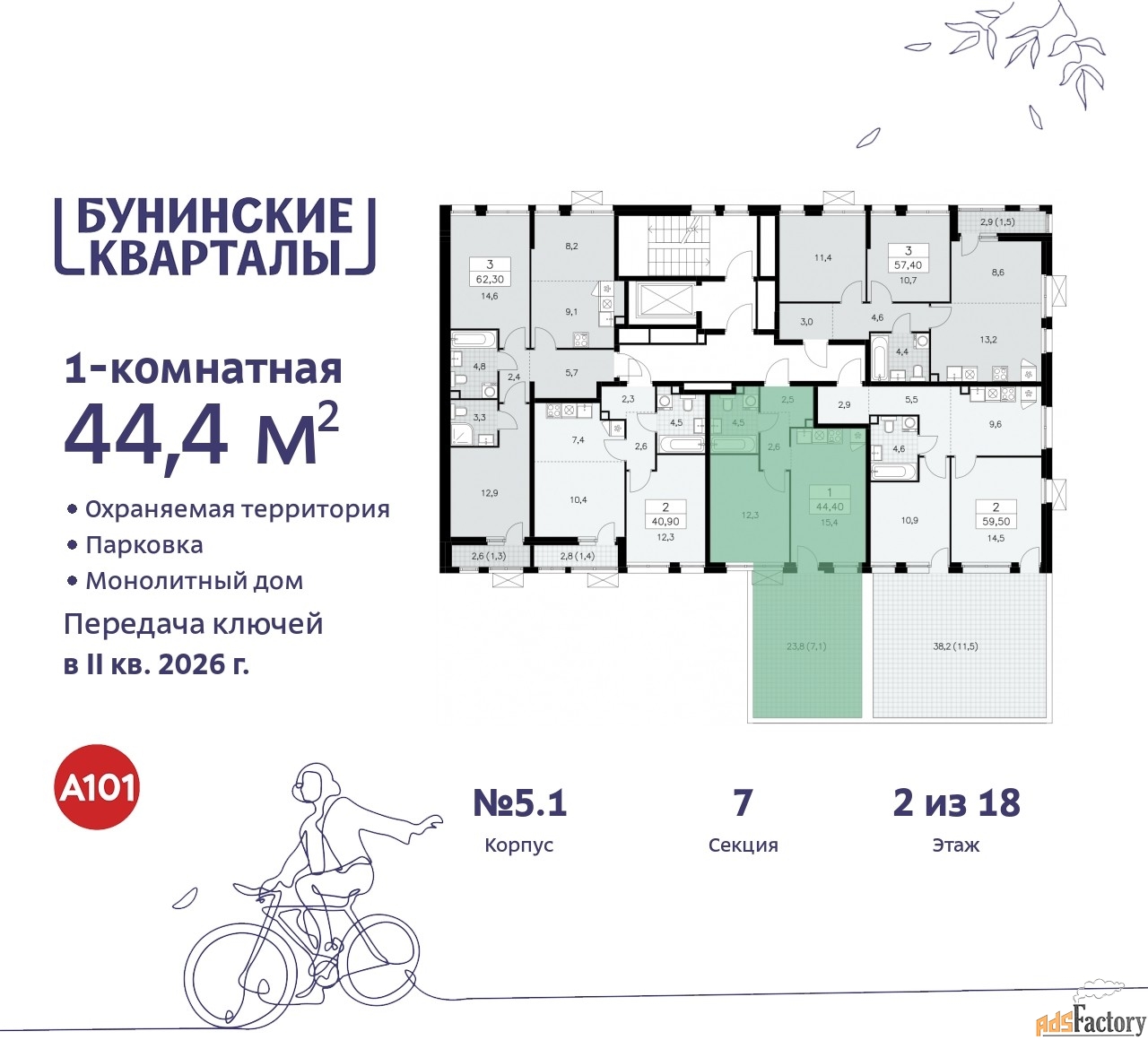 Дом монолитный, многоподъездный, переменной этажности, от 9 до 18 этажей. Квартира находится в 7-й секции высотой 9 этажей в корпусе 5.1. На этаже 5 квартир. В подъезде 1 грузовой лифт. Начало строительства - 4 квартал 2023 года. Окончание строительства - 2 квартал 2026 года. Оформление сделки по договору долевого участия.