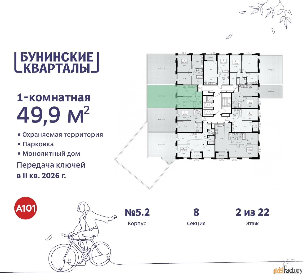 Квартира находится в корпусе 5.2. Дом монолитный, одноподъездный, высотой 22 этажа. На этаже 9 квартир. В подъезде 1 пассажирский и 2 грузовых лифта. Начало строительства - 4 квартал 2023 года. Окончание строительства - 2 квартал 2026 года. Оформление сделки по договору долевого участия.
