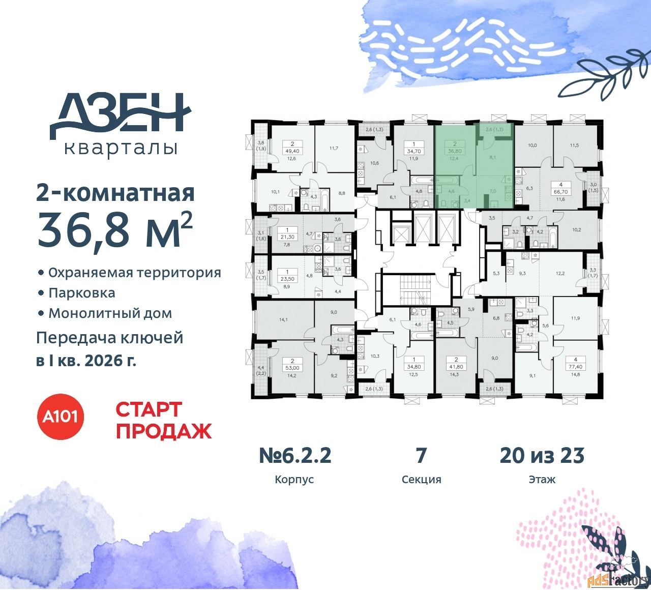Квартира находится в корпусе 6.2.2. Дом монолитный, одноподъездный, высотой 23 этажа. На этаже 10 квартир. В подъезде 1 пассажирский и 2 грузовых лифта. Начало строительства - 4 квартал 2023 года. Окончание строительства - 1 квартал 2026 года. Оформление сделки по договору долевого участия.